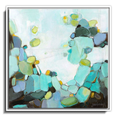 The canvas is wrapped and stretched similar to a gallery wrap and then mounted inside a wooden frame, leaving a small "gap", to create the illusion that the canvas is floating within the frame.