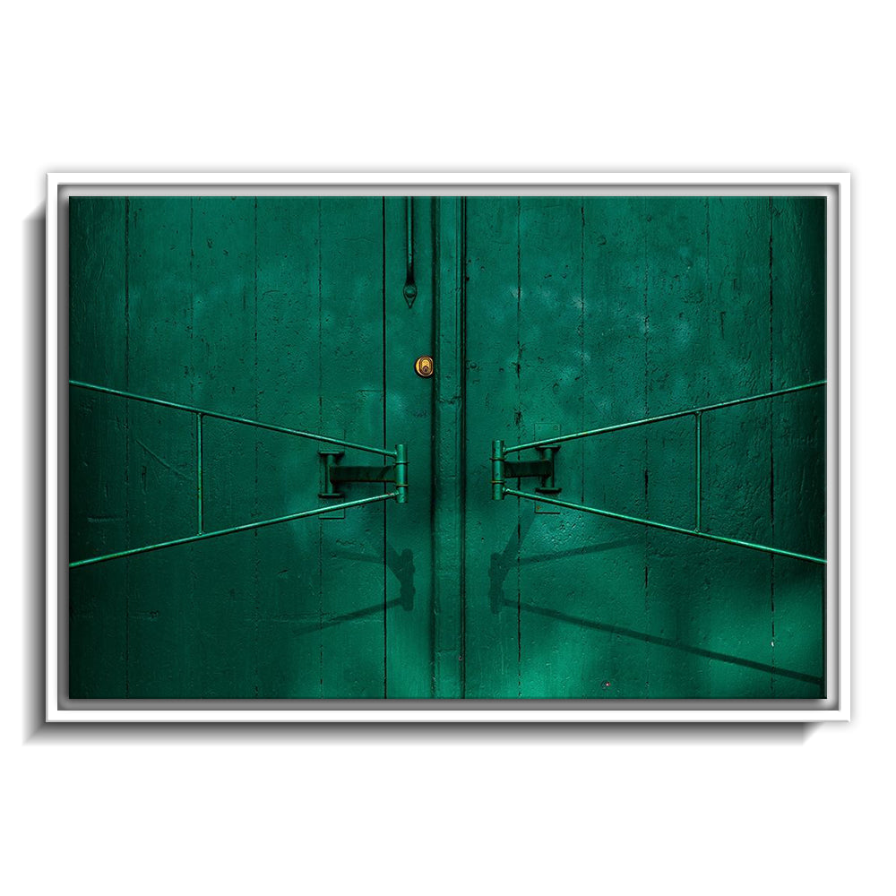The canvas is wrapped and stretched similar to a gallery wrap and then mounted inside a wooden frame, leaving a small "gap", to create the illusion that the canvas is floating within the frame.