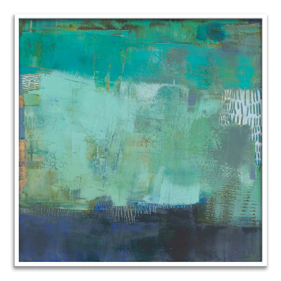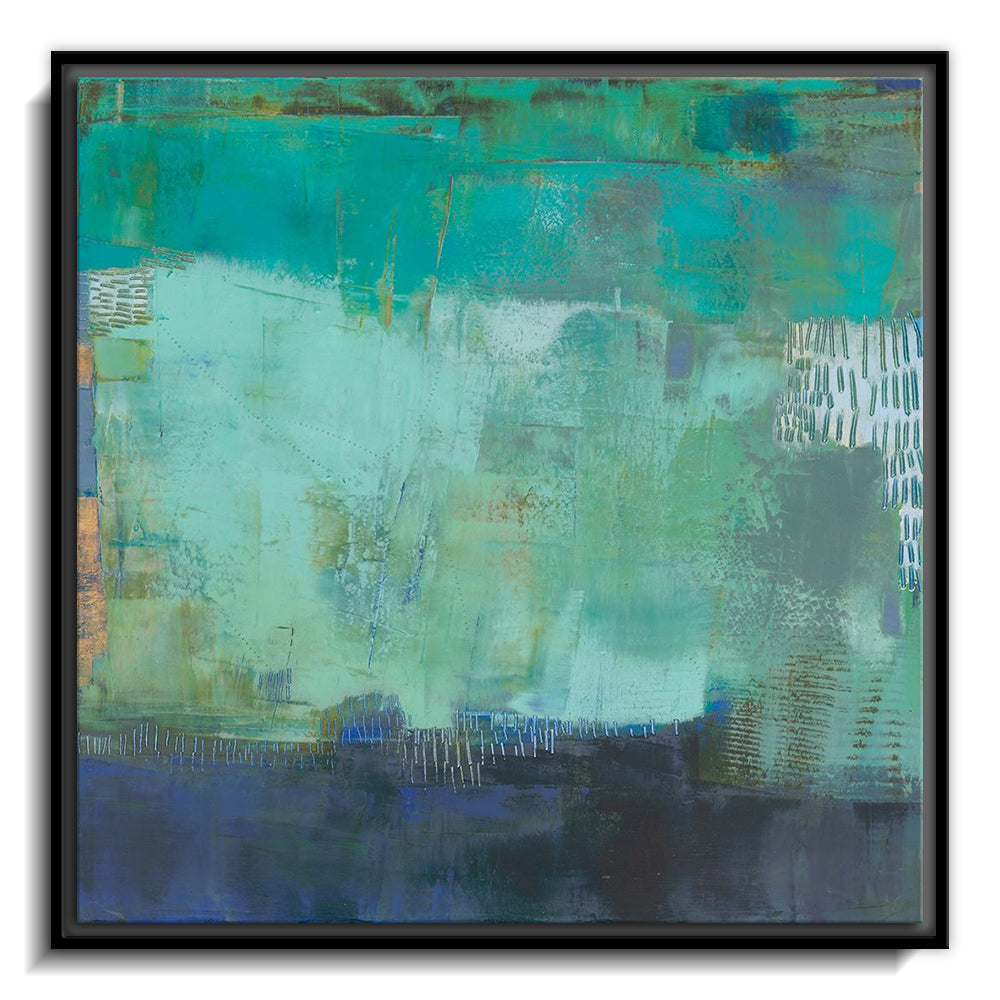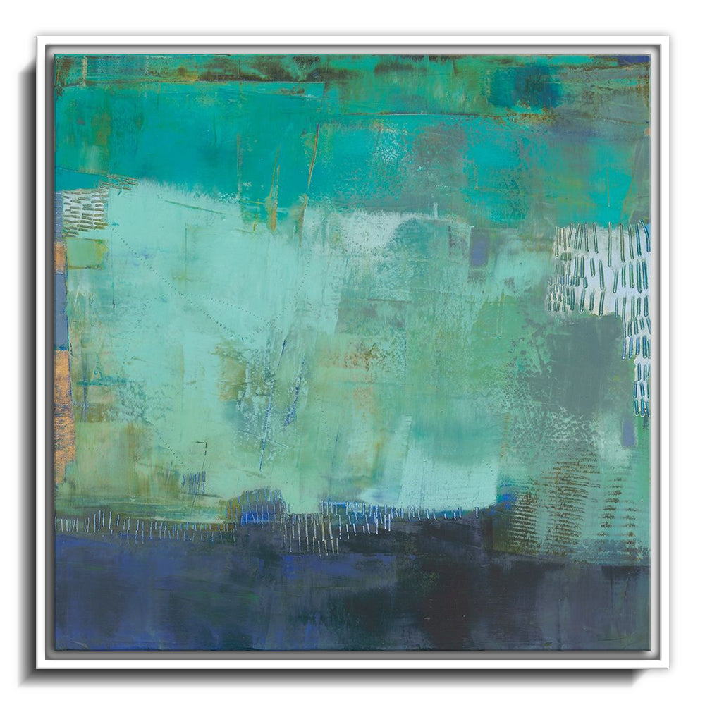 The canvas is wrapped and stretched similar to a gallery wrap and then mounted inside a wooden frame, leaving a small "gap", to create the illusion that the canvas is floating within the frame.