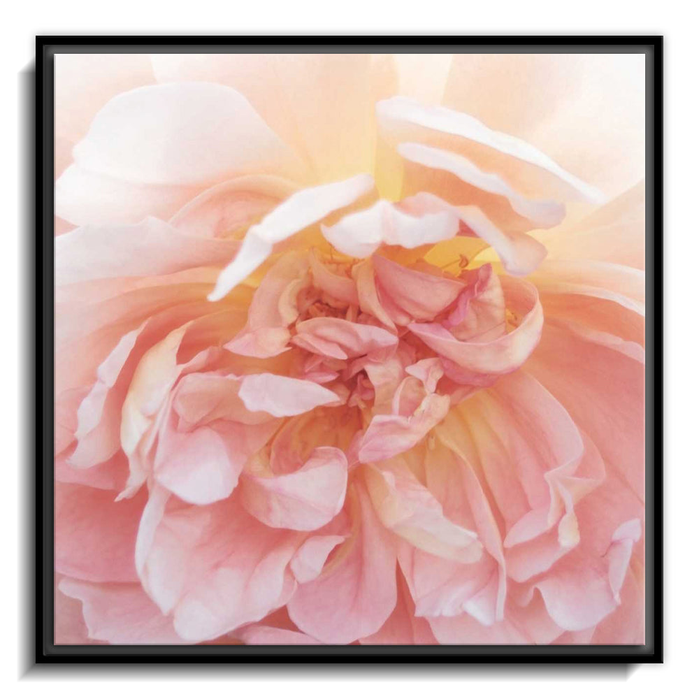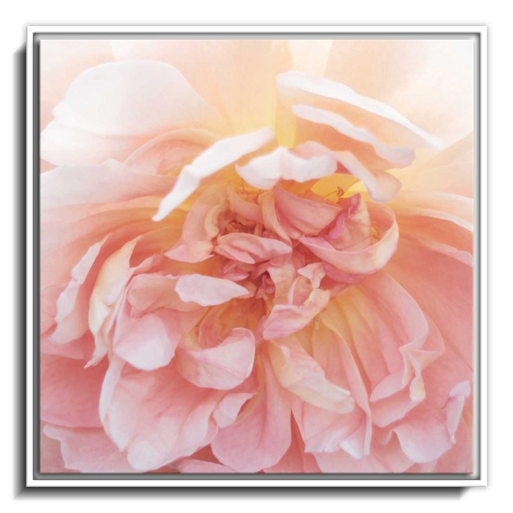 The canvas is wrapped and stretched similar to a gallery wrap and then mounted inside a wooden frame, leaving a small "gap", to create the illusion that the canvas is floating within the frame.