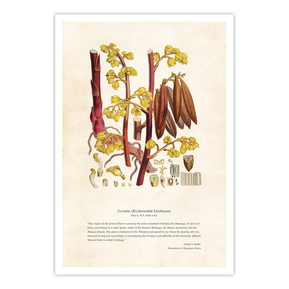 “The subject of the present Plate is certainly the most remarkable Orchid in the Himalaya, if not in all India, and belongs to a small genus, native of the Eastern Himalaya, the Khasia mountains, and the Malayan Islands. The plant is dedicated by Dr. Thomson and myself to our friend Dr. Lindley, who has laboured so long and successfully in investigating the structure and affinities of the extremely difficult Natural Order to which it belongs.”