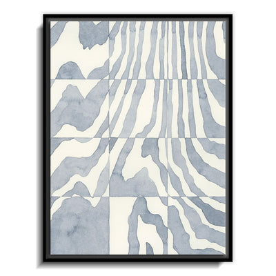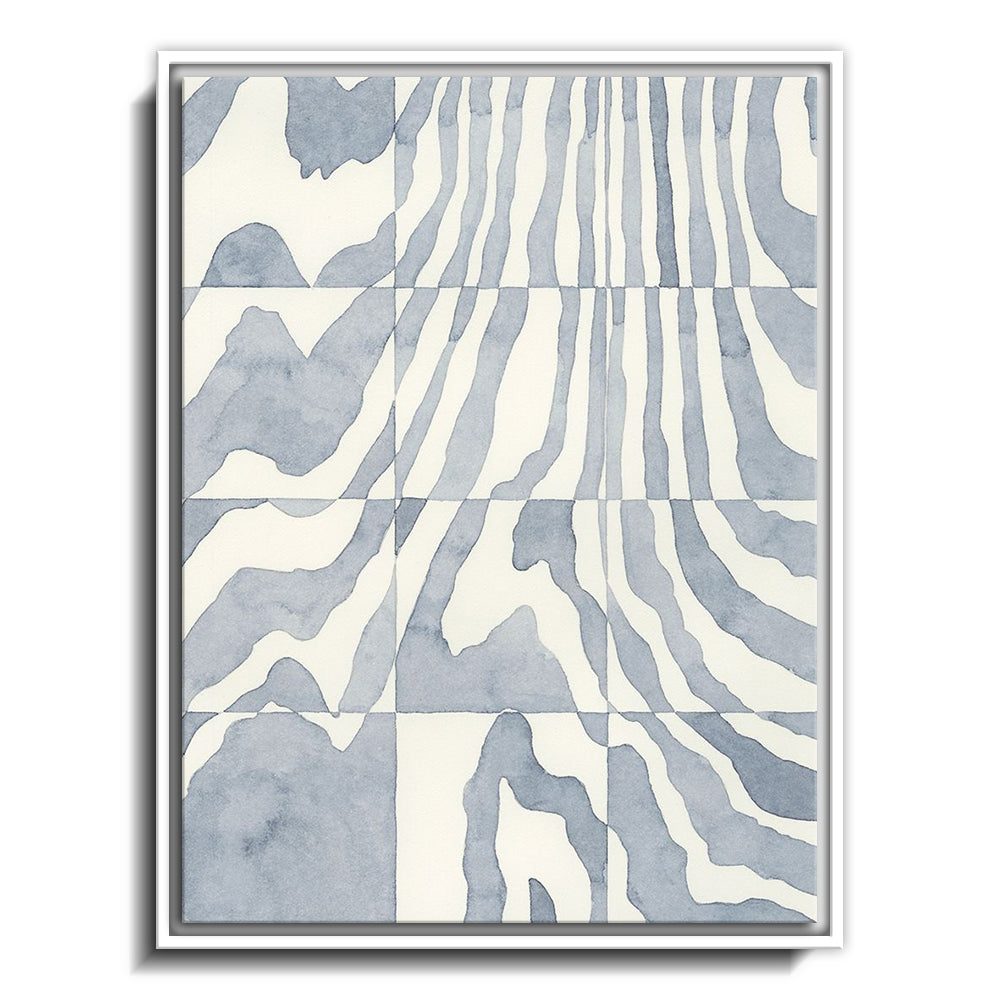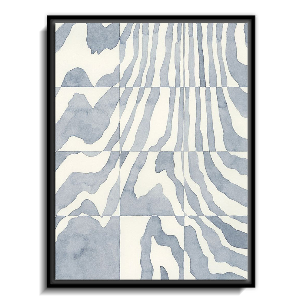 The canvas is wrapped and stretched similar to a gallery wrap and then mounted inside a wooden frame, leaving a small "gap", to create the illusion that the canvas is floating within the frame.