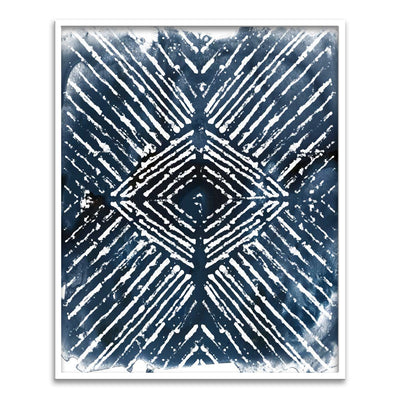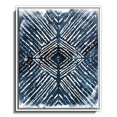 The canvas is wrapped and stretched similar to a gallery wrap and then mounted inside a wooden frame, leaving a small "gap", to create the illusion that the canvas is floating within the frame.