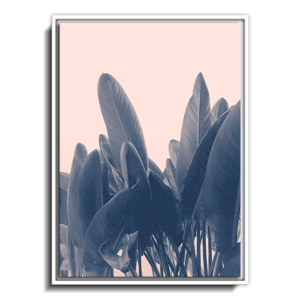The canvas is wrapped and stretched similar to a gallery wrap and then mounted inside a wooden frame, leaving a small "gap", to create the illusion that the canvas is floating within the frame.