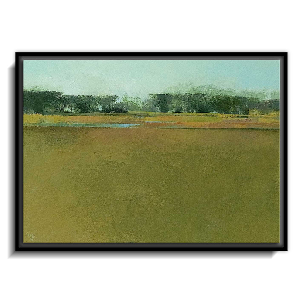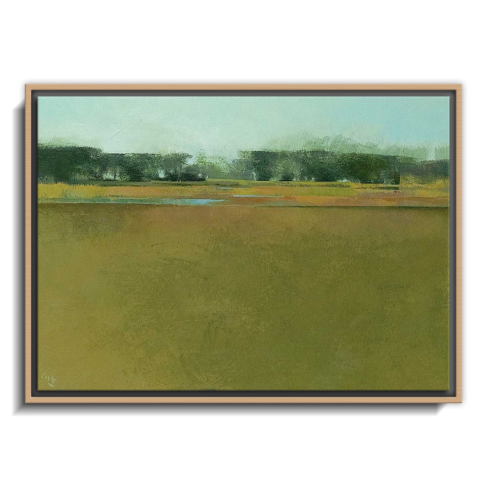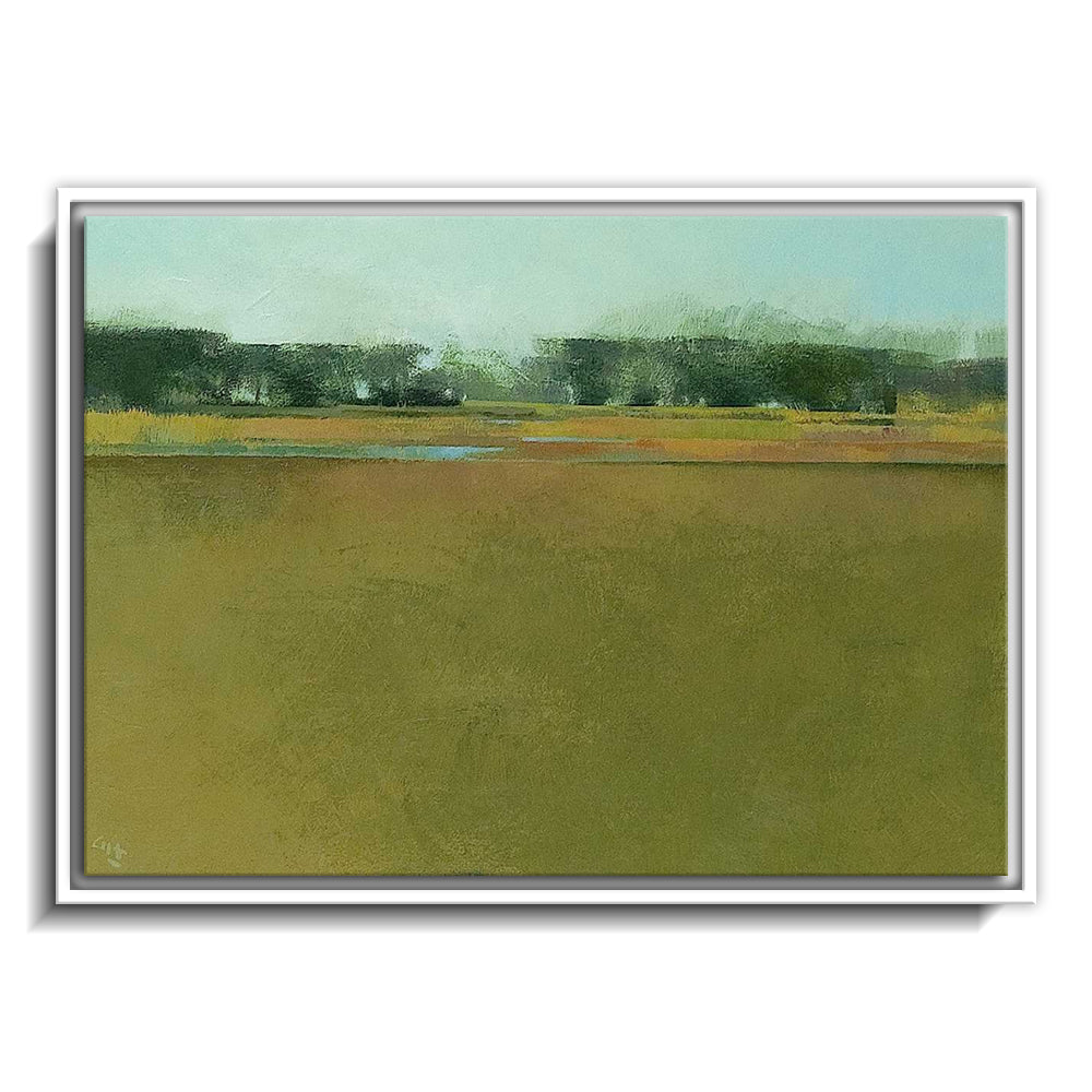 The canvas is wrapped and stretched similar to a gallery wrap and then mounted inside a wooden frame, leaving a small "gap", to create the illusion that the canvas is floating within the frame.
