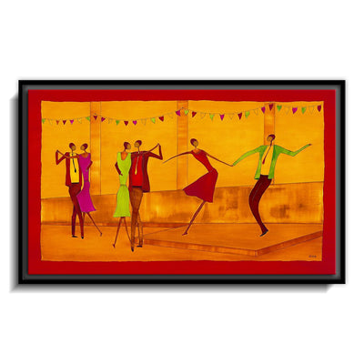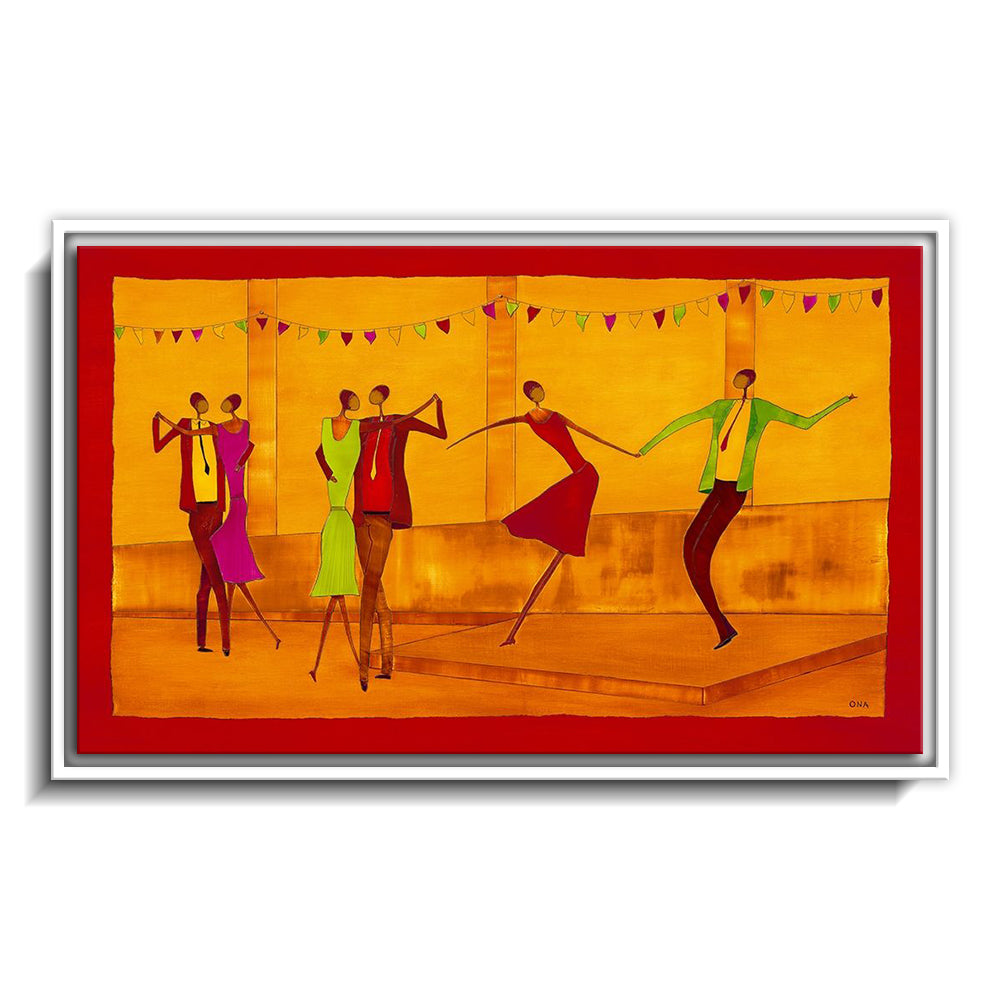 The canvas is wrapped and stretched similar to a gallery wrap and then mounted inside a wooden frame, leaving a small "gap", to create the illusion that the canvas is floating within the frame.