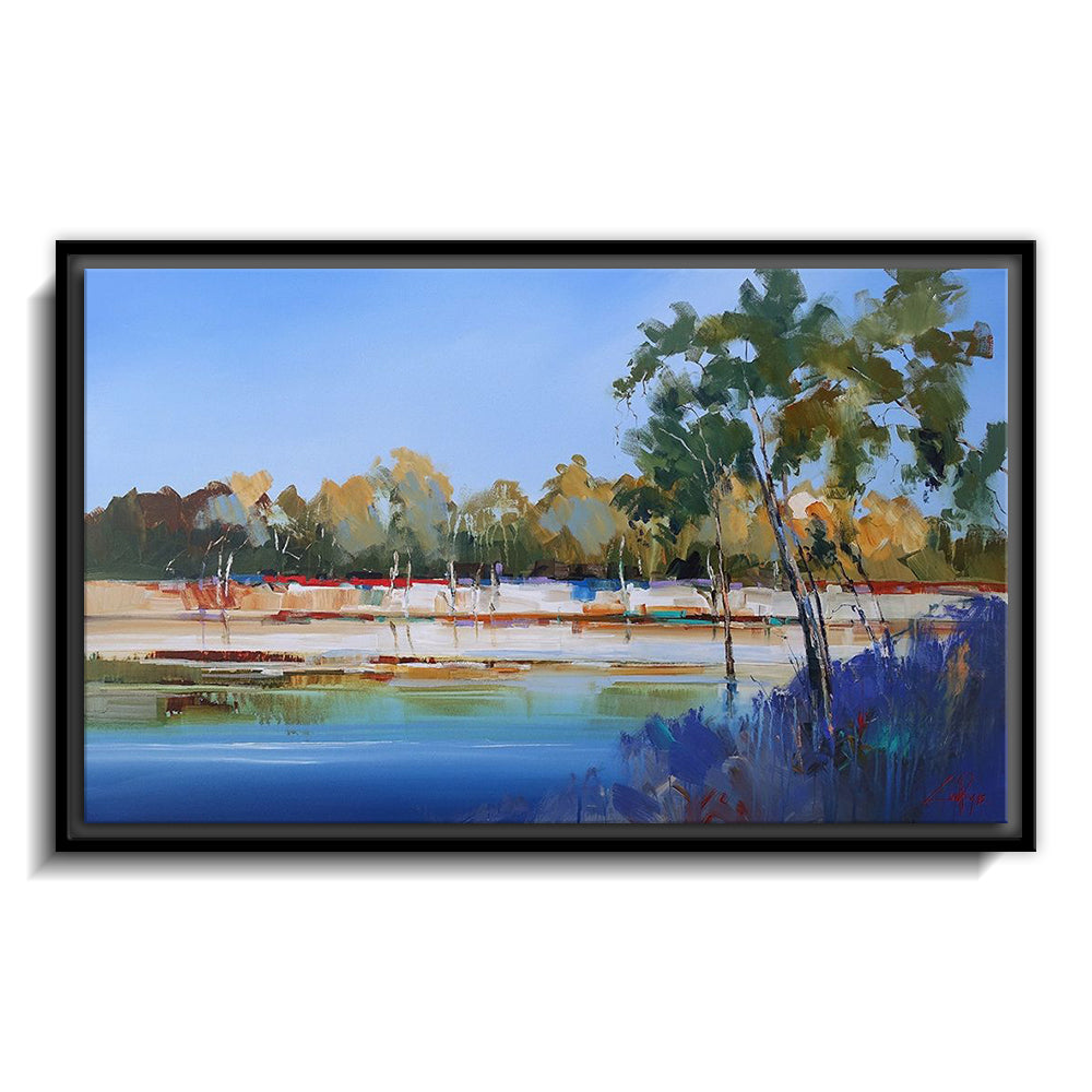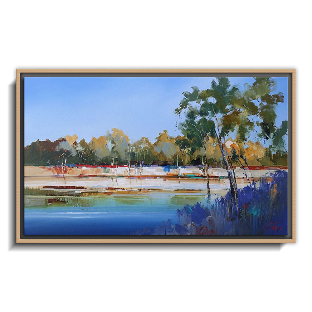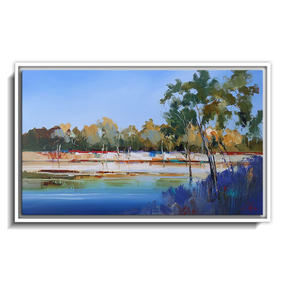 The canvas is wrapped and stretched similar to a gallery wrap and then mounted inside a wooden frame, leaving a small "gap", to create the illusion that the canvas is floating within the frame.