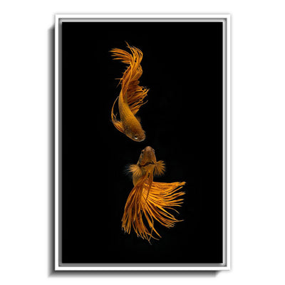 The canvas is wrapped and stretched similar to a gallery wrap and then mounted inside a wooden frame, leaving a small "gap", to create the illusion that the canvas is floating within the frame.