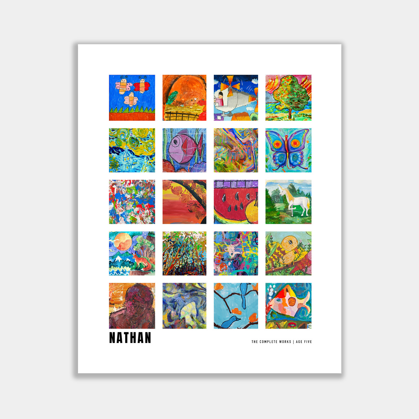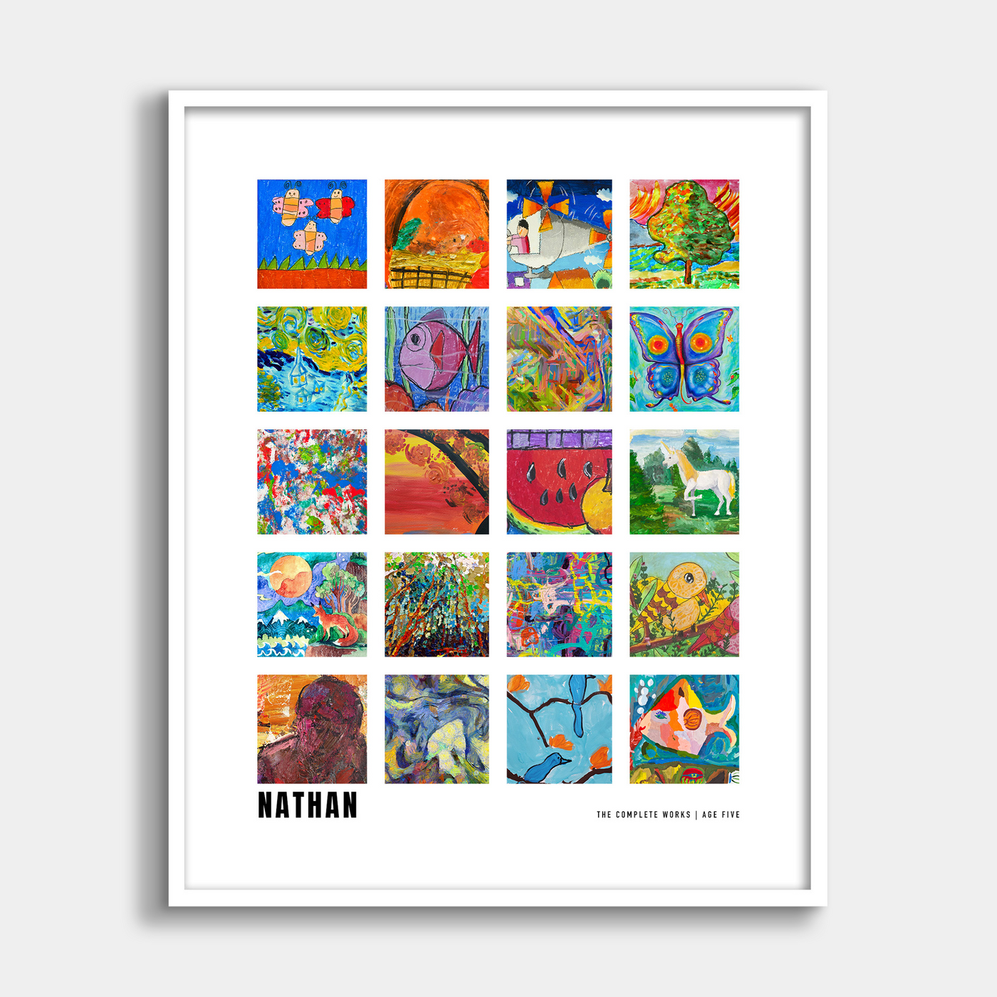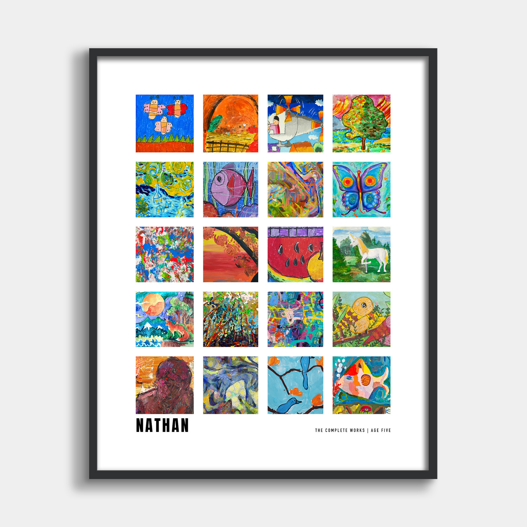 This collage theme requires anywhere from 10 to 20 artworks and is currently depicted with another child's paintings. After you place your order, an automated email will be sent to you to collect images of your artworks, which will be used to recreate this collage for you.