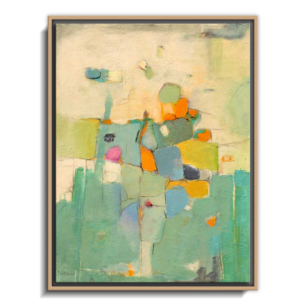 The canvas is wrapped and stretched similar to a gallery wrap and then mounted inside a wooden frame, leaving a small "gap", to create the illusion that the canvas is floating within the frame.