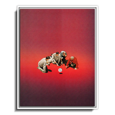 The canvas is wrapped and stretched similar to a gallery wrap and then mounted inside a wooden frame, leaving a small "gap", to create the illusion that the canvas is floating within the frame.