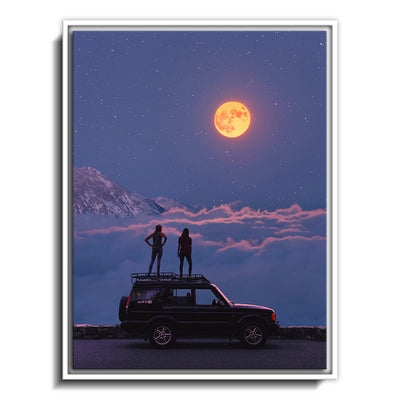 The canvas is wrapped and stretched similar to a gallery wrap and then mounted inside a wooden frame, leaving a small "gap", to create the illusion that the canvas is floating within the frame.