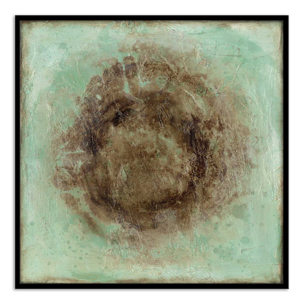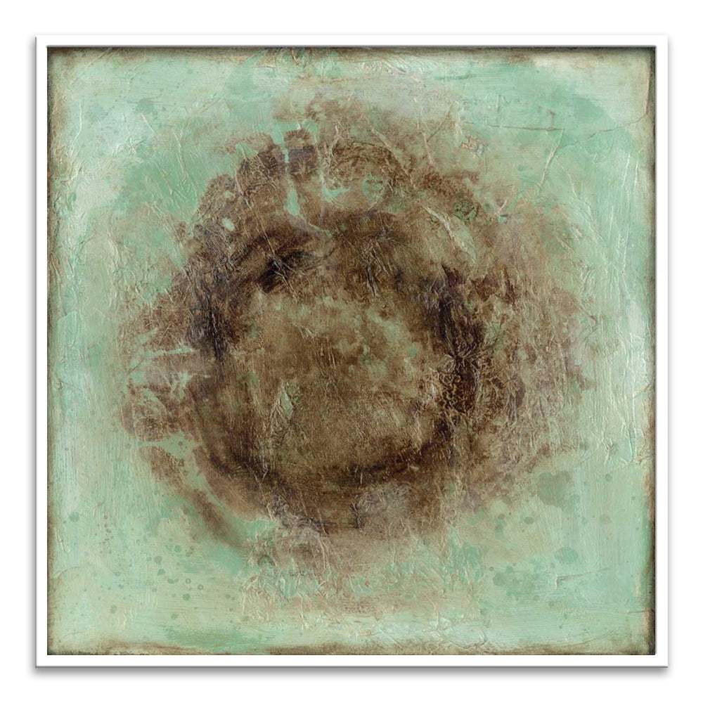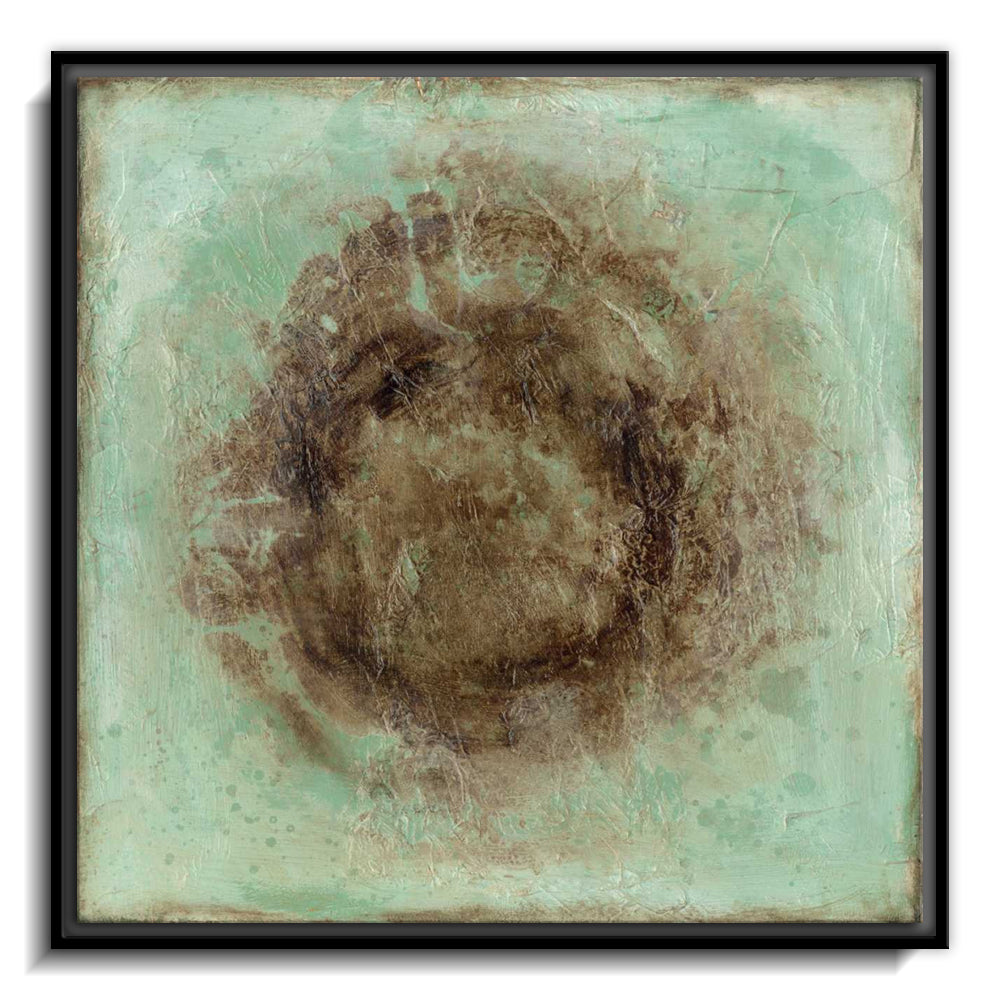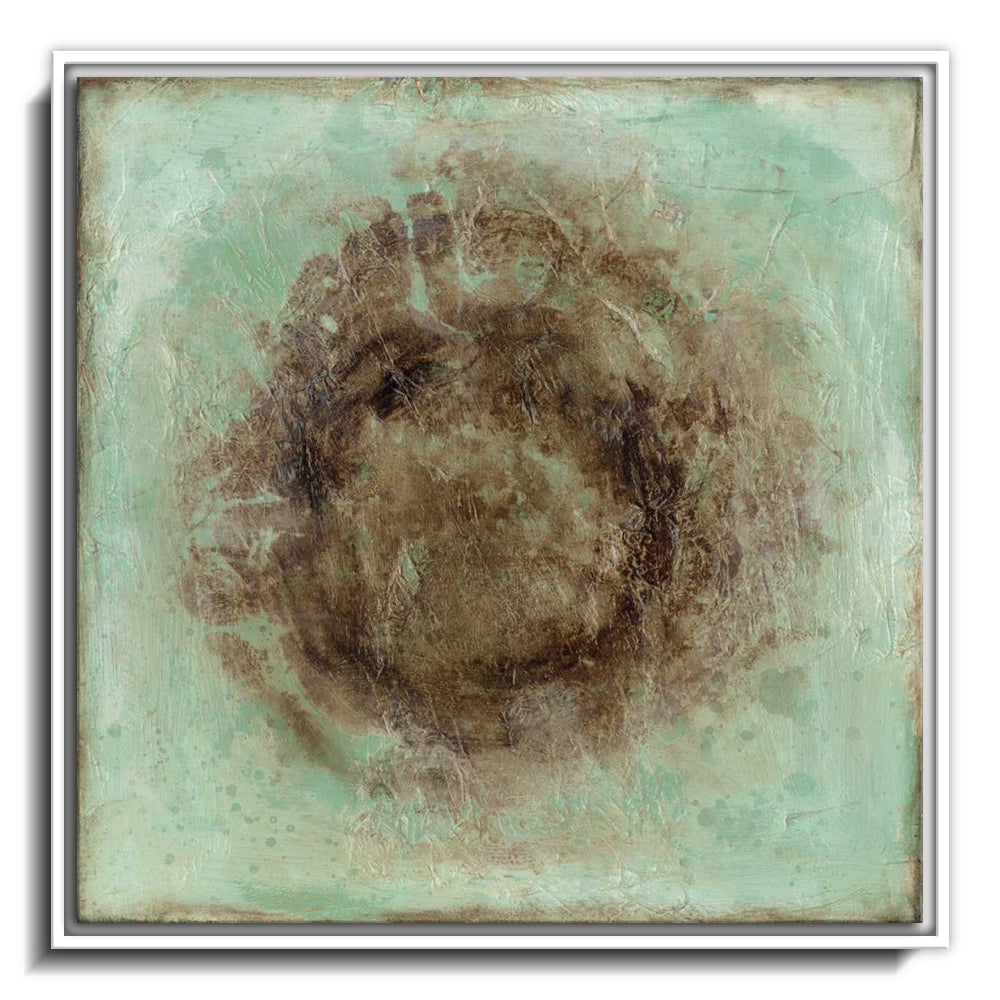 The canvas is wrapped and stretched similar to a gallery wrap and then mounted inside a wooden frame, leaving a small "gap", to create the illusion that the canvas is floating within the frame.