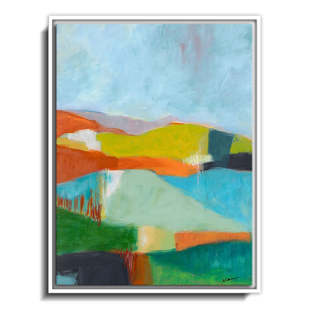 The canvas is wrapped and stretched similar to a gallery wrap and then mounted inside a wooden frame, leaving a small "gap", to create the illusion that the canvas is floating within the frame.