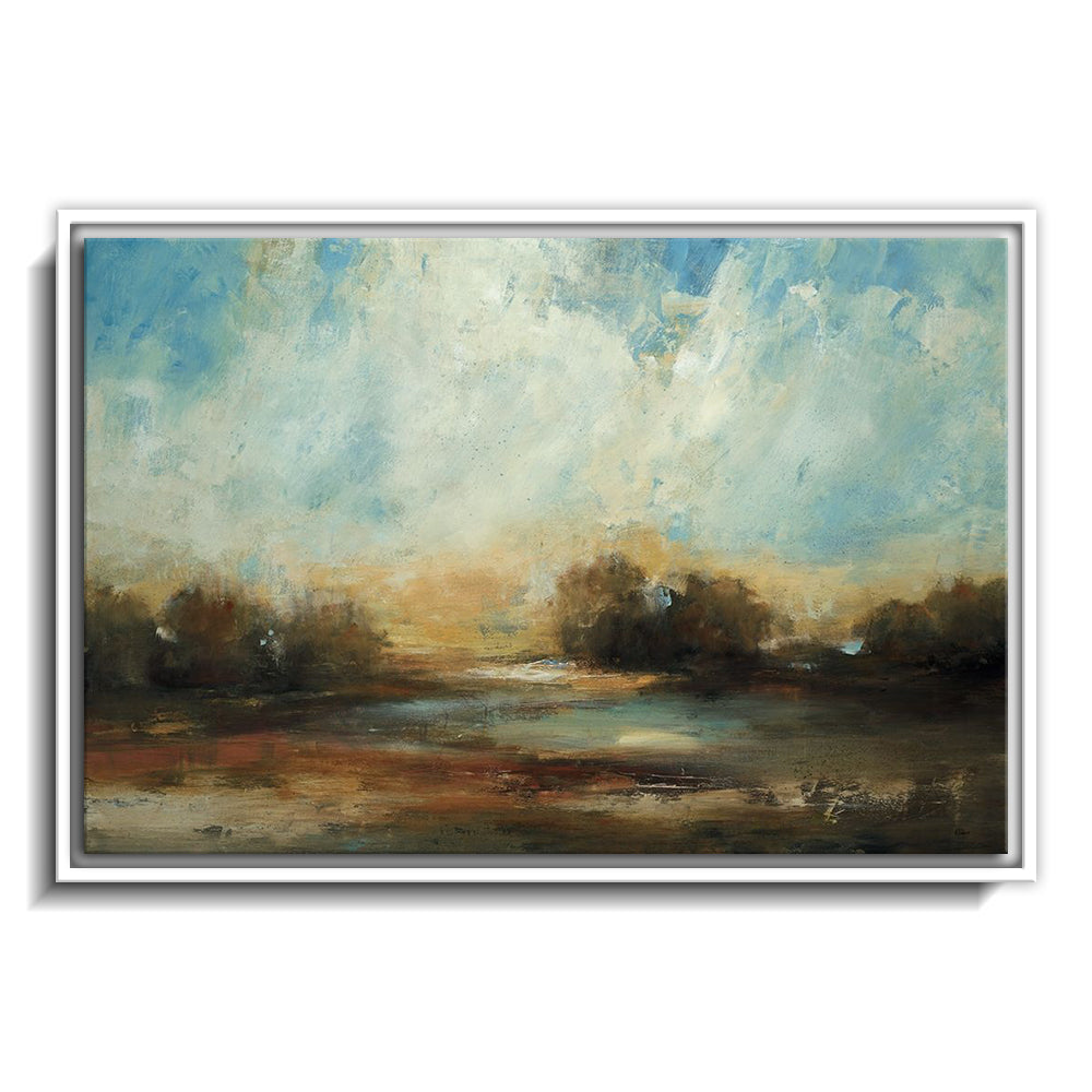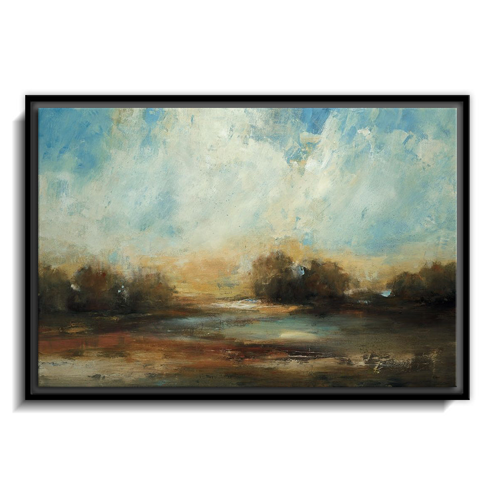 The canvas is wrapped and stretched similar to a gallery wrap and then mounted inside a wooden frame, leaving a small "gap", to create the illusion that the canvas is floating within the frame.