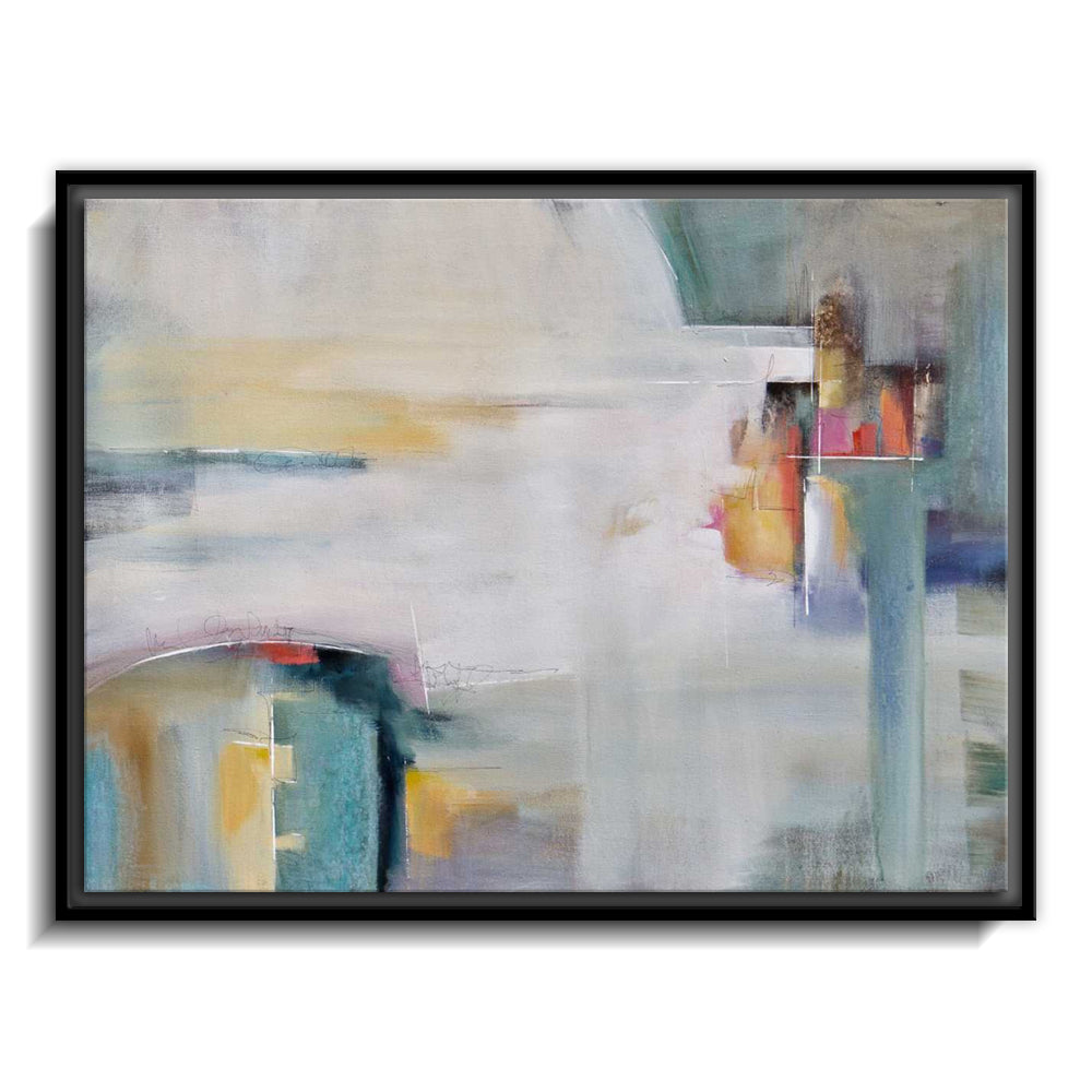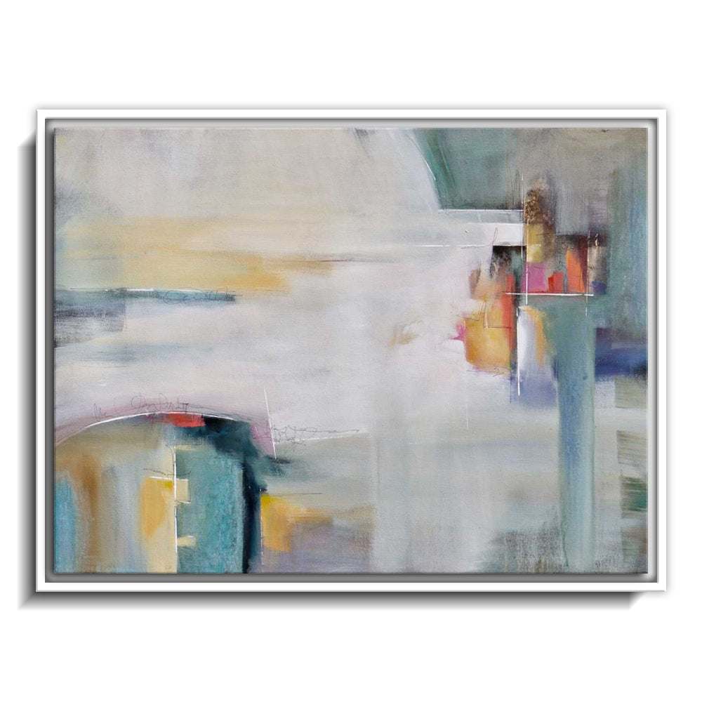 The canvas is wrapped and stretched similar to a gallery wrap and then mounted inside a wooden frame, leaving a small "gap", to create the illusion that the canvas is floating within the frame.