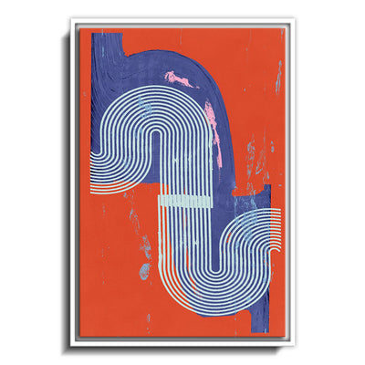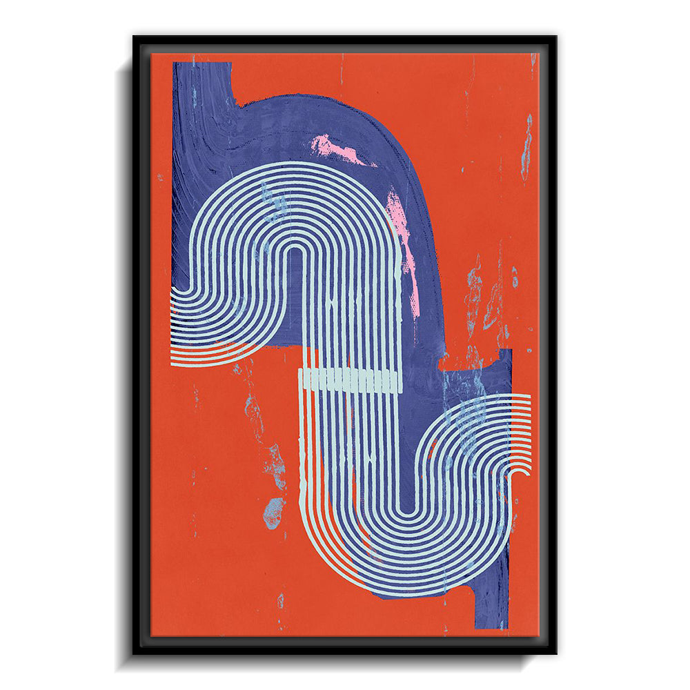 The canvas is wrapped and stretched similar to a gallery wrap and then mounted inside a wooden frame, leaving a small "gap", to create the illusion that the canvas is floating within the frame.