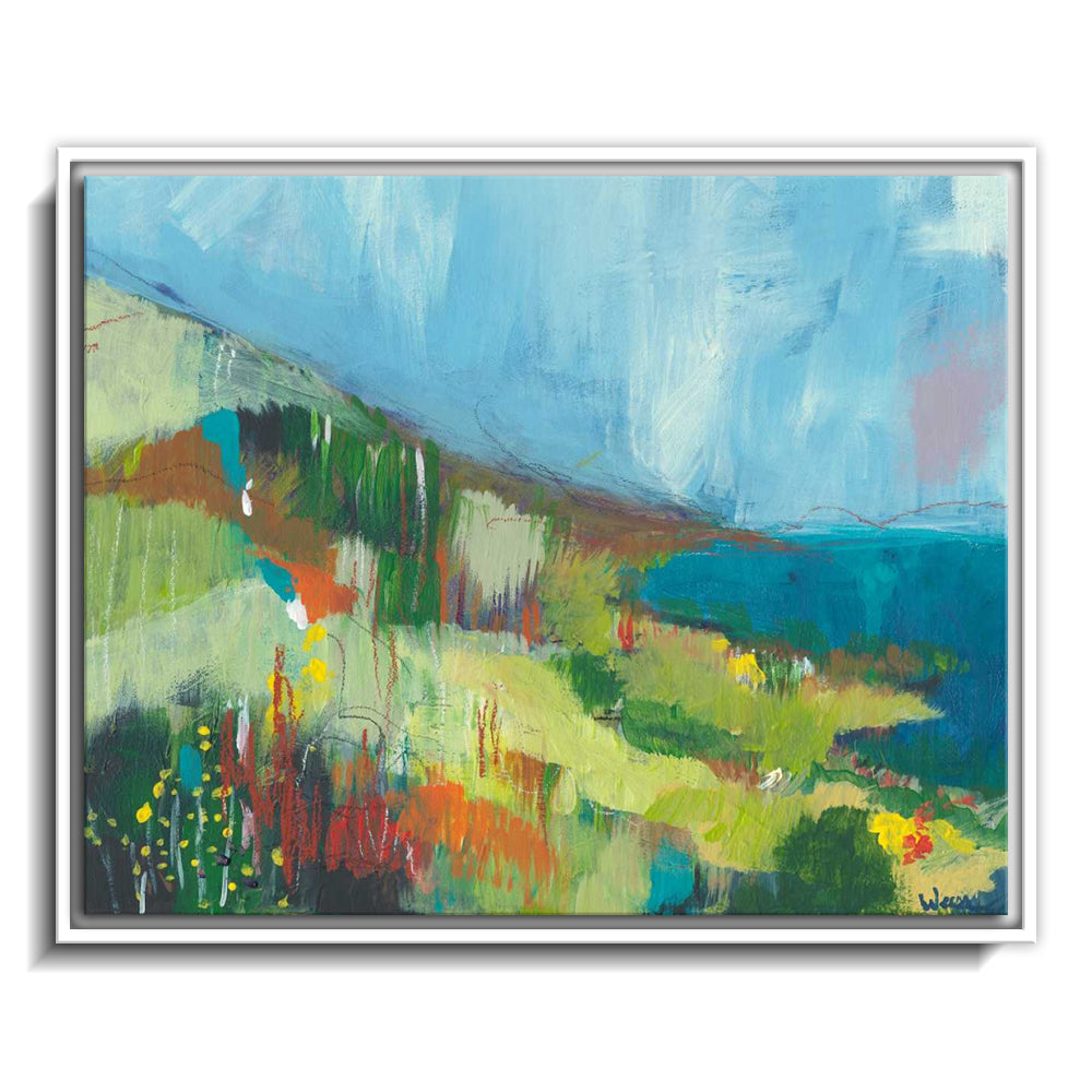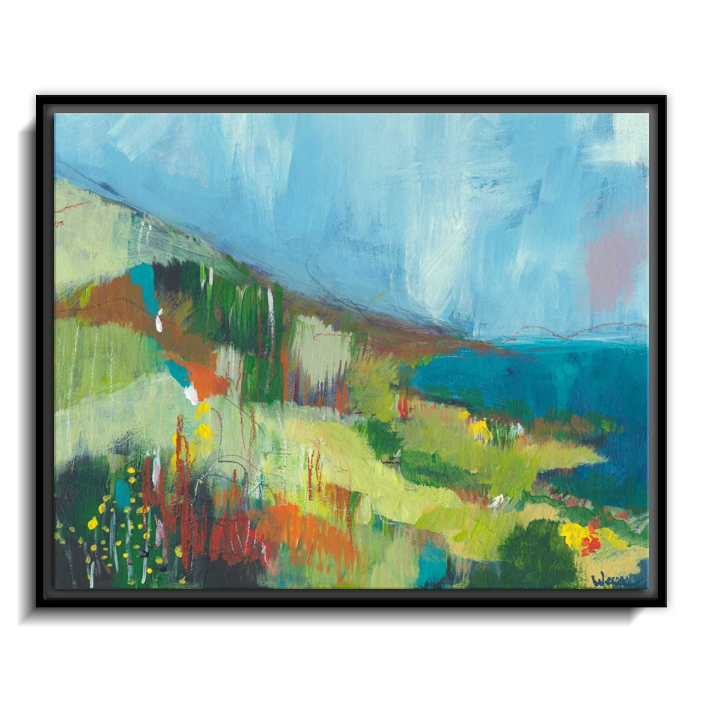 The canvas is wrapped and stretched similar to a gallery wrap and then mounted inside a wooden frame, leaving a small "gap", to create the illusion that the canvas is floating within the frame.