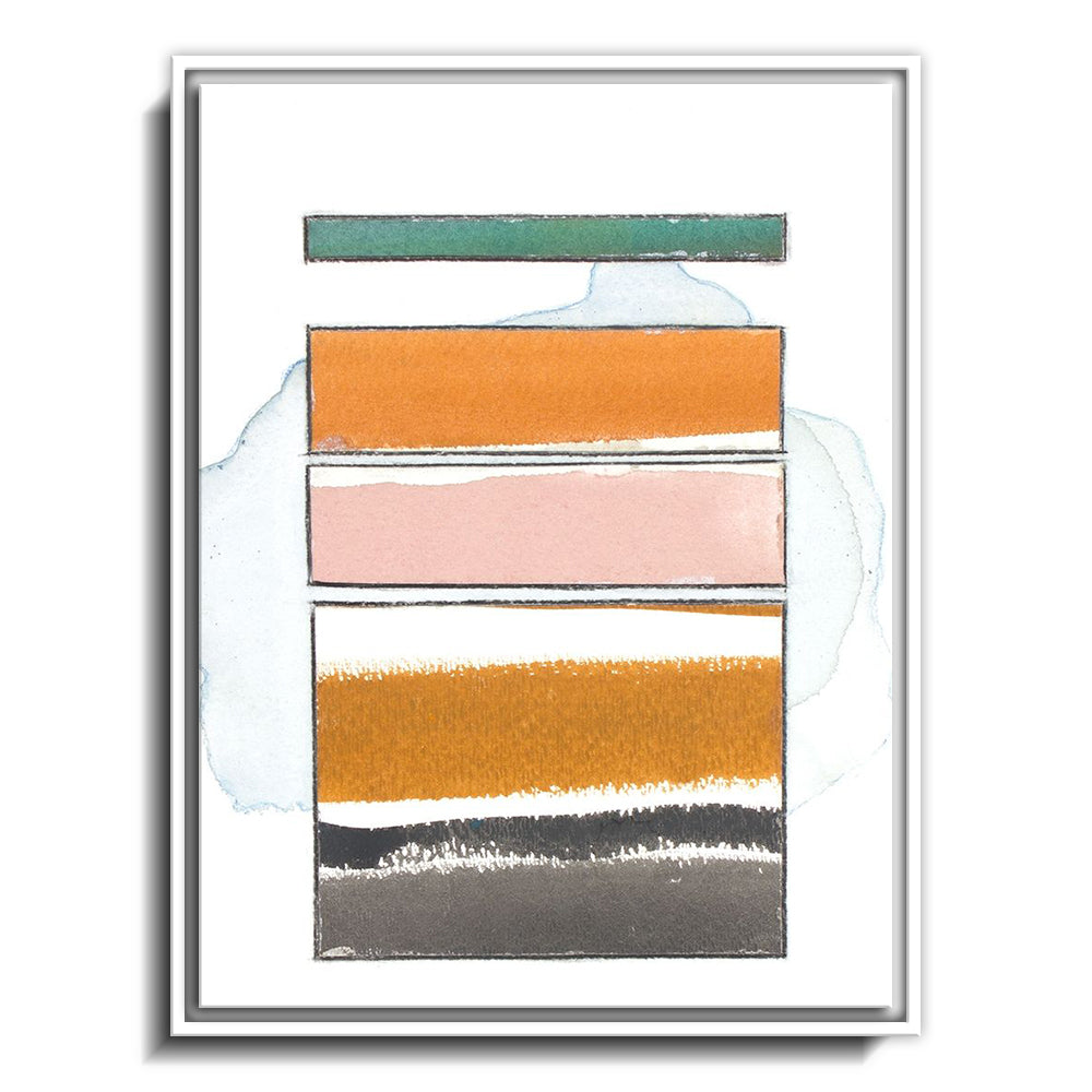 The canvas is wrapped and stretched similar to a gallery wrap and then mounted inside a wooden frame, leaving a small "gap", to create the illusion that the canvas is floating within the frame.