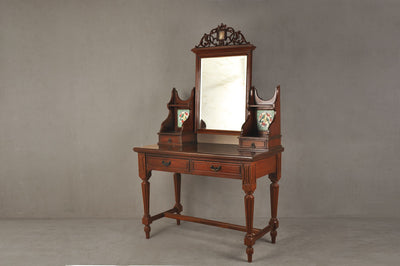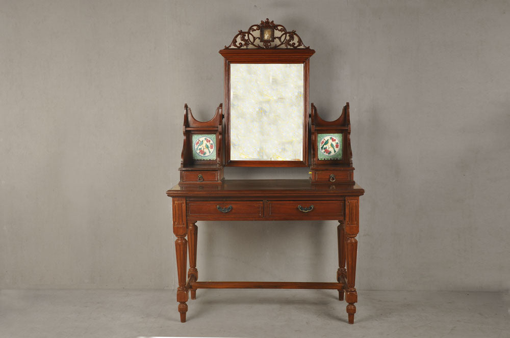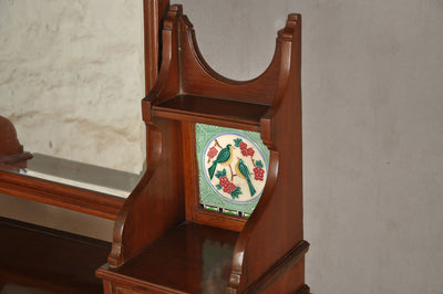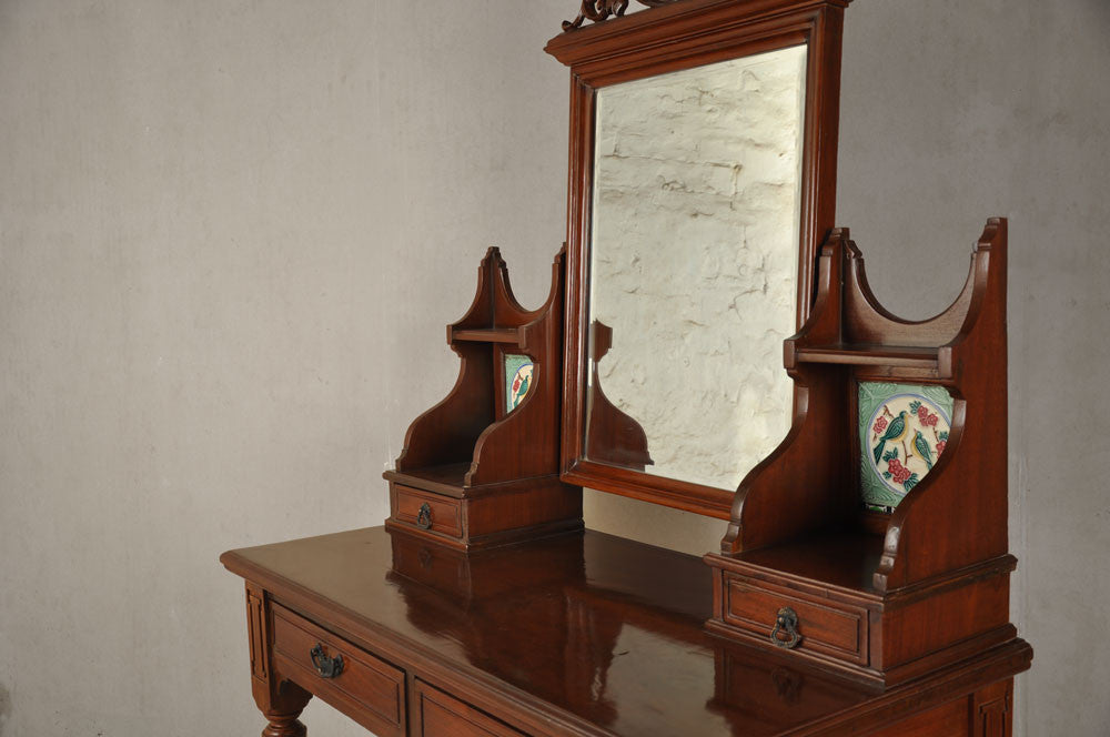 DESCRIPTION A mahogany Victorian dresser with unique tile inserts is an ideal piece to be used as a dresser or hallway/ lobby stand. It has two main pull-out drawers and two smaller drawers to hold knick-knacks. The dresser has a removable swivel mirror with an intricately carved crown. There is a slot to hold a photograph or maybe another tiny mirror in the crown.