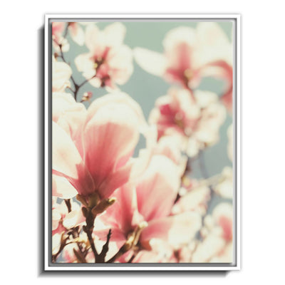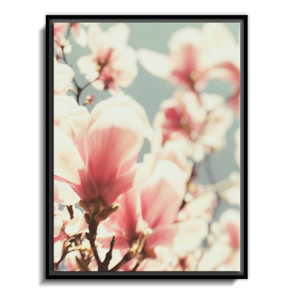 The canvas is wrapped and stretched similar to a gallery wrap and then mounted inside a wooden frame, leaving a small "gap", to create the illusion that the canvas is floating within the frame.