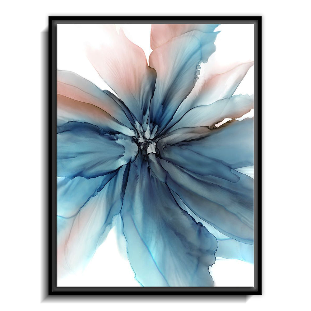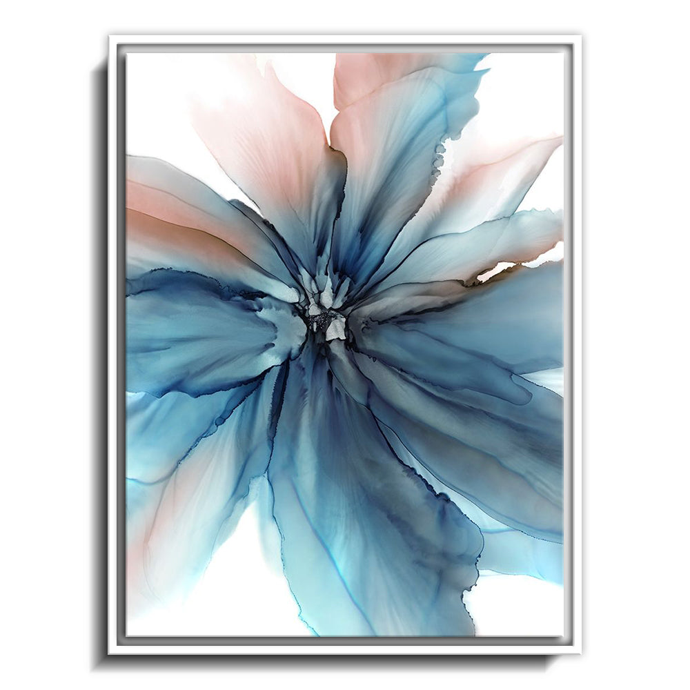The canvas is wrapped and stretched similar to a gallery wrap and then mounted inside a wooden frame, leaving a small "gap", to create the illusion that the canvas is floating within the frame.