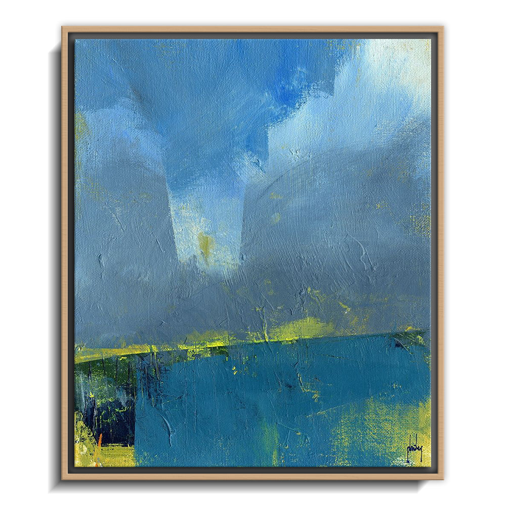 The canvas is wrapped and stretched similar to a gallery wrap and then mounted inside a wooden frame, leaving a small "gap", to create the illusion that the canvas is floating within the frame.