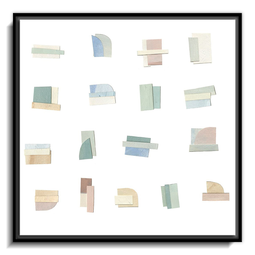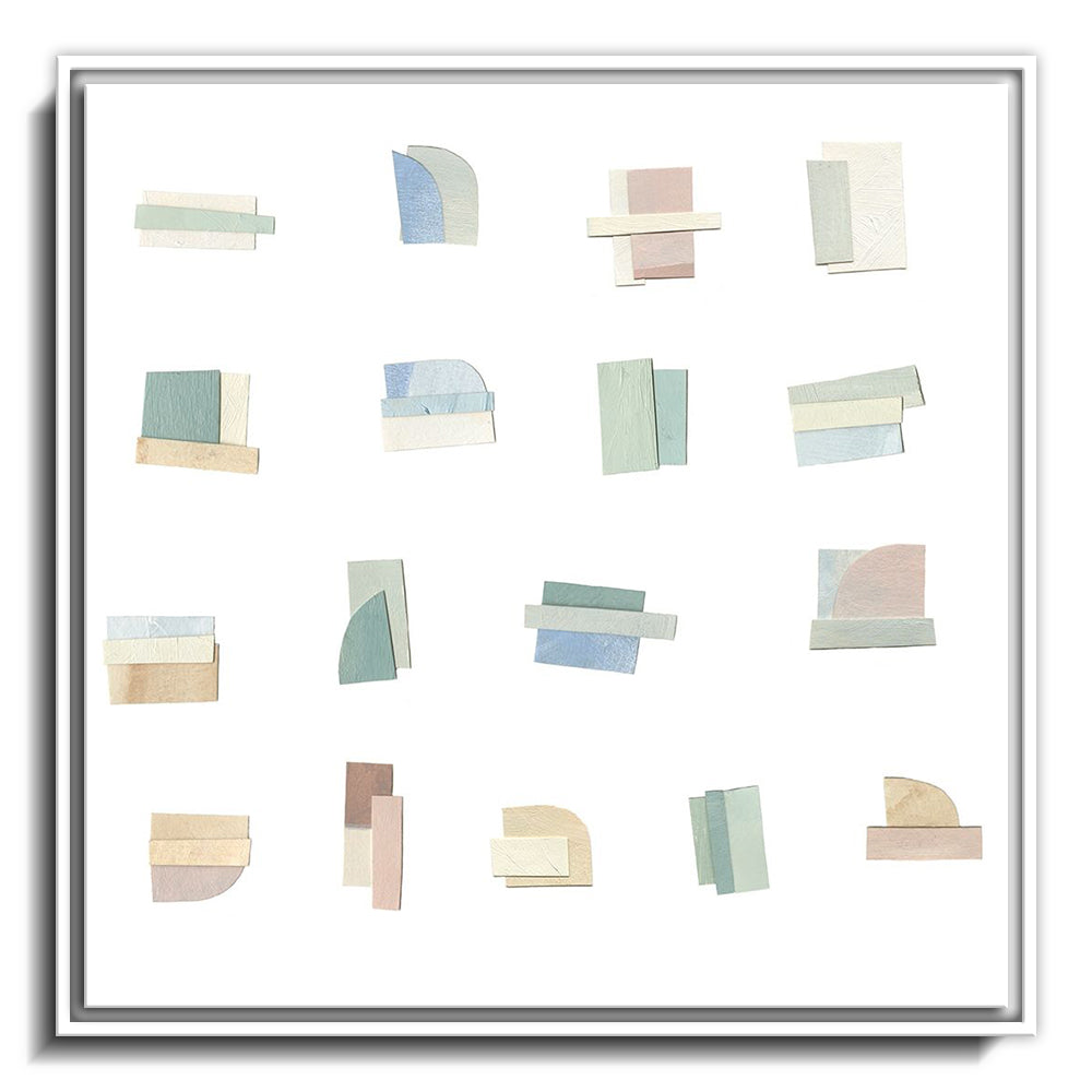 The canvas is wrapped and stretched similar to a gallery wrap and then mounted inside a wooden frame, leaving a small "gap", to create the illusion that the canvas is floating within the frame.
