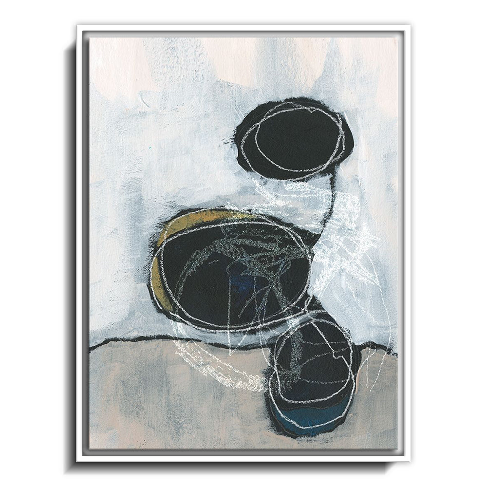 The canvas is wrapped and stretched similar to a gallery wrap and then mounted inside a wooden frame, leaving a small "gap", to create the illusion that the canvas is floating within the frame.