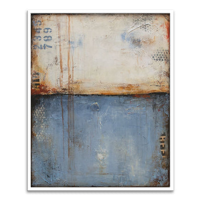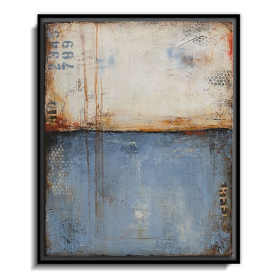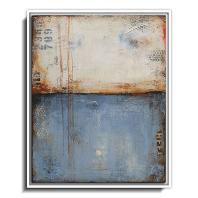 The canvas is wrapped and stretched similar to a gallery wrap and then mounted inside a wooden frame, leaving a small "gap", to create the illusion that the canvas is floating within the frame.