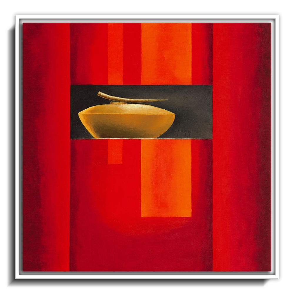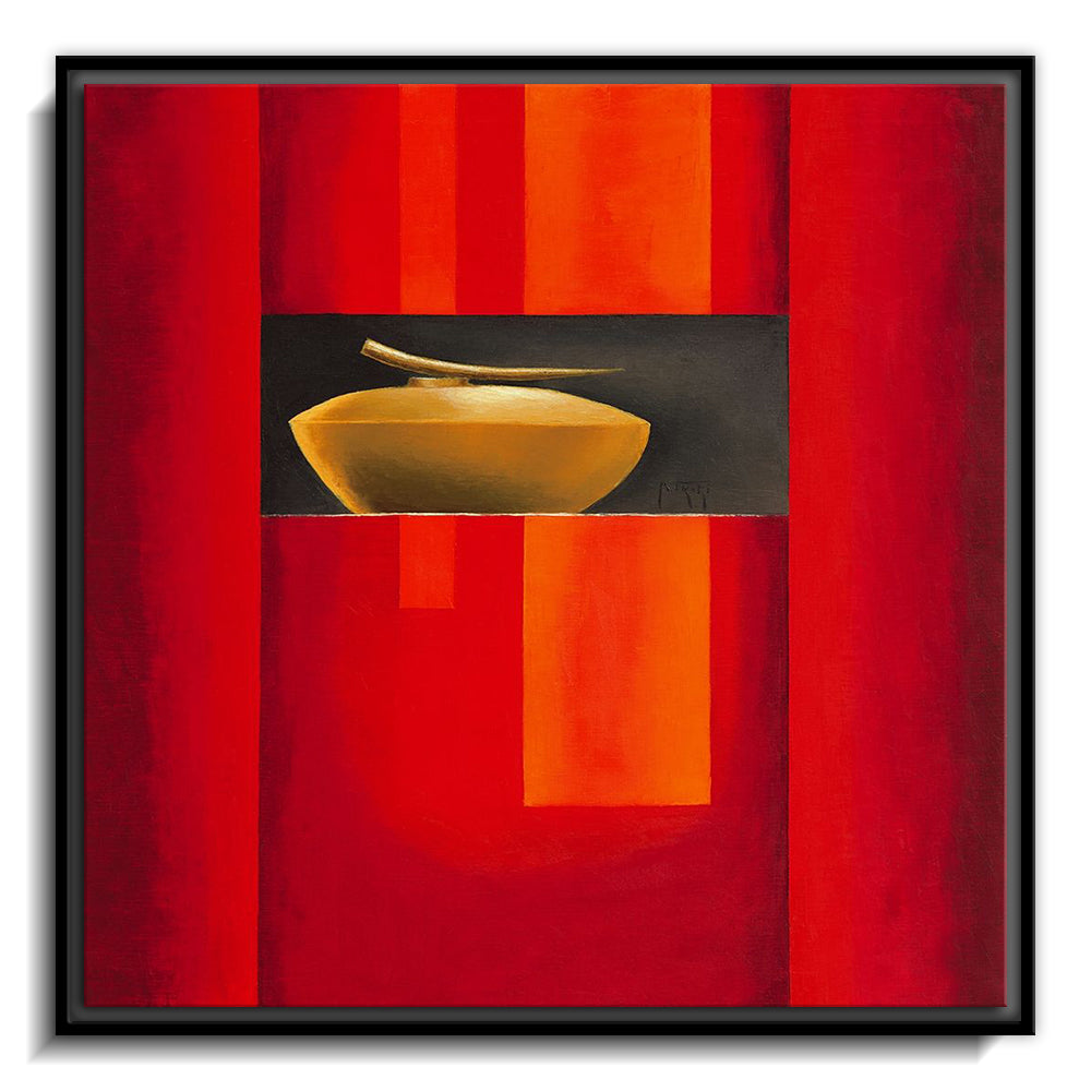 The canvas is wrapped and stretched similar to a gallery wrap and then mounted inside a wooden frame, leaving a small "gap", to create the illusion that the canvas is floating within the frame.