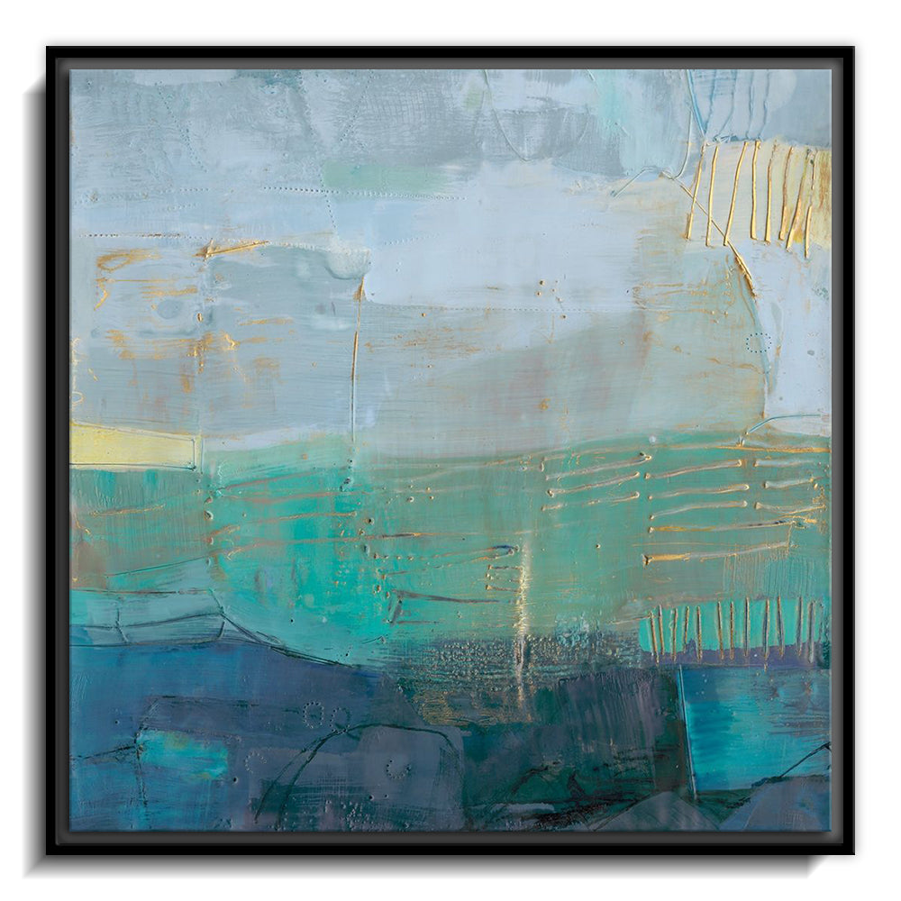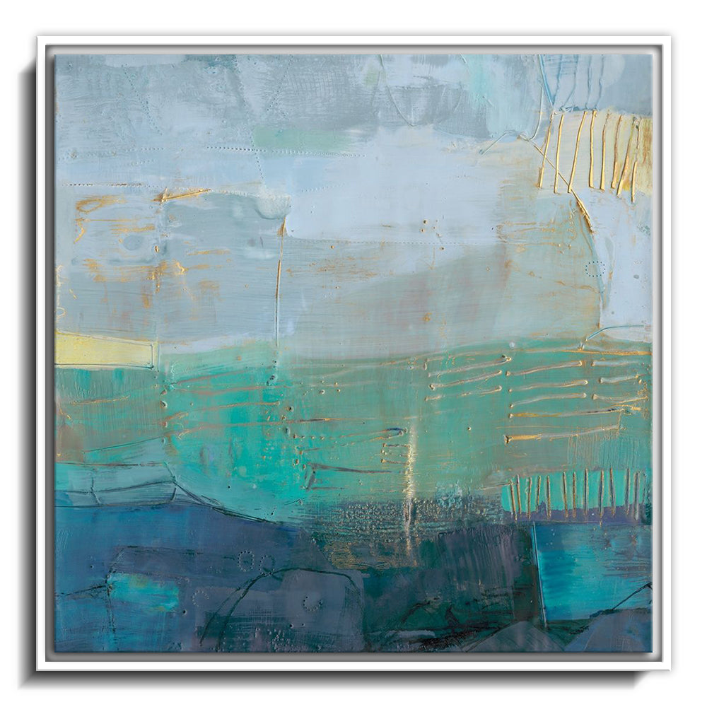 The canvas is wrapped and stretched similar to a gallery wrap and then mounted inside a wooden frame, leaving a small "gap", to create the illusion that the canvas is floating within the frame.