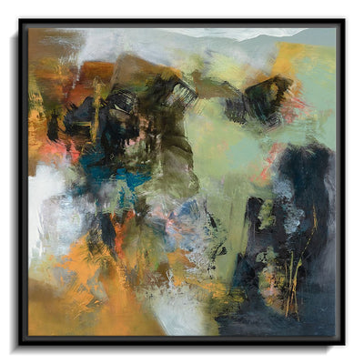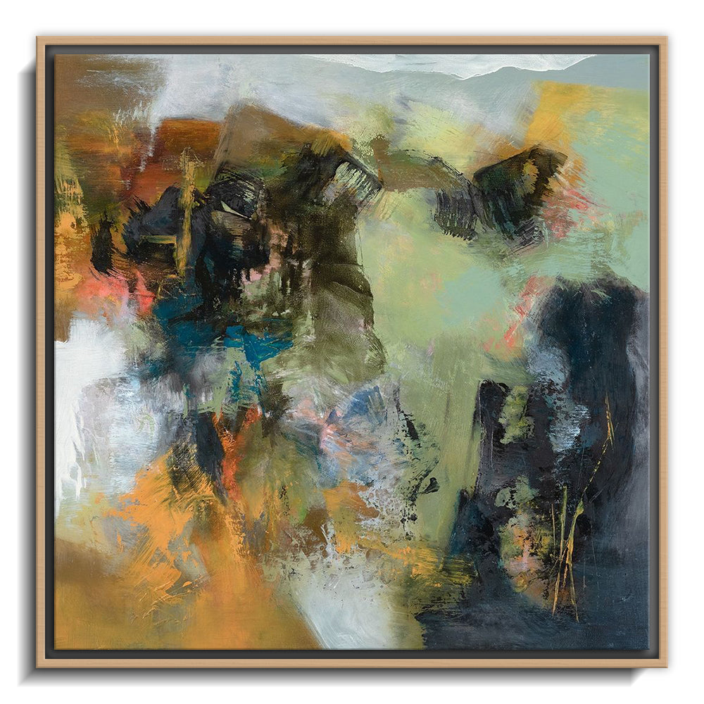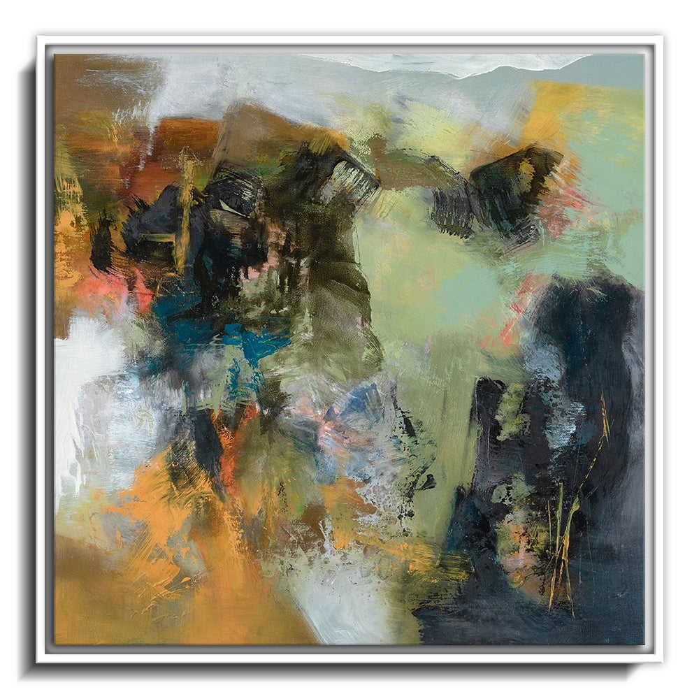 The canvas is wrapped and stretched similar to a gallery wrap and then mounted inside a wooden frame, leaving a small "gap", to create the illusion that the canvas is floating within the frame.