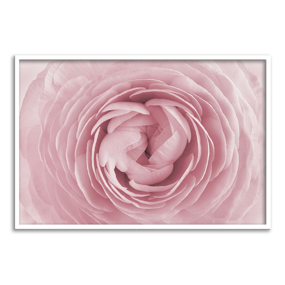 The canvas is wrapped and stretched similar to a gallery wrap and then mounted inside a wooden frame, leaving a small "gap", to create the illusion that the canvas is floating within the frame.