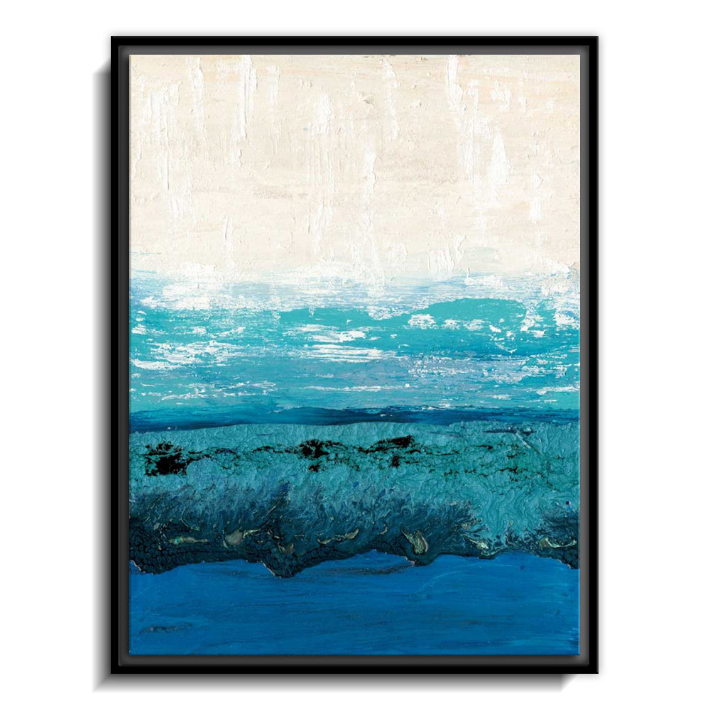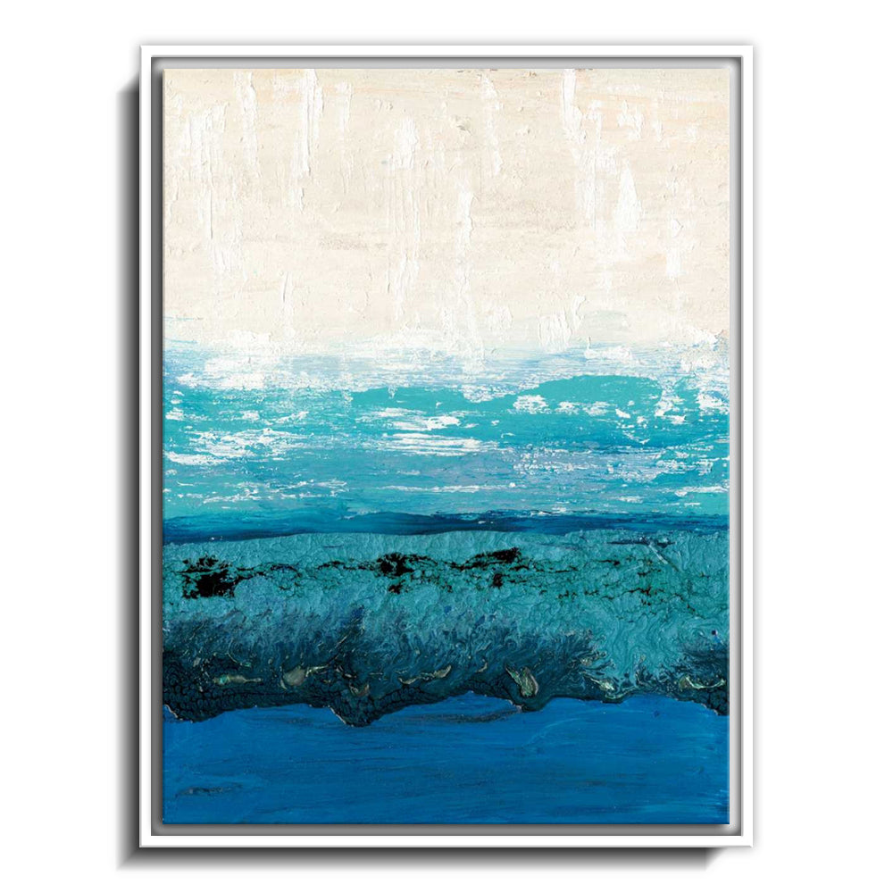 The canvas is wrapped and stretched similar to a gallery wrap and then mounted inside a wooden frame, leaving a small "gap", to create the illusion that the canvas is floating within the frame.