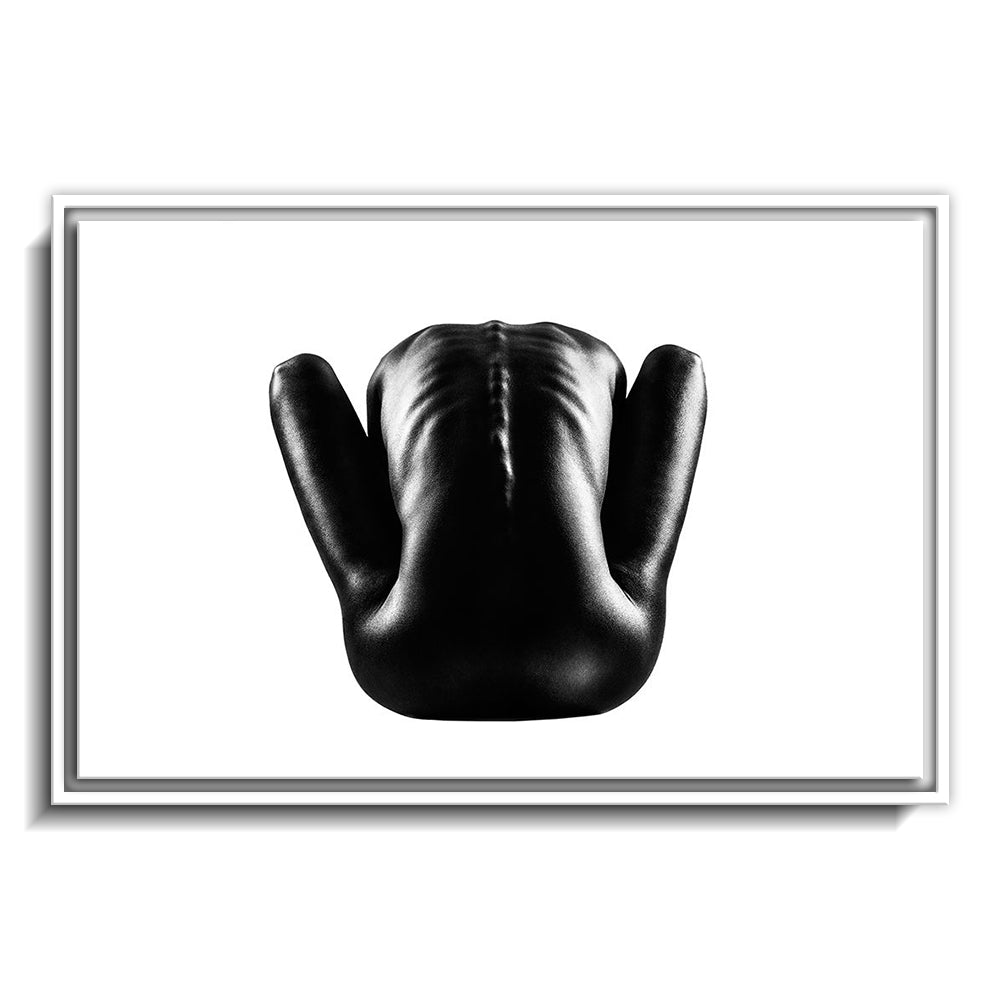 The canvas is wrapped and stretched similar to a gallery wrap and then mounted inside a wooden frame, leaving a small "gap", to create the illusion that the canvas is floating within the frame.