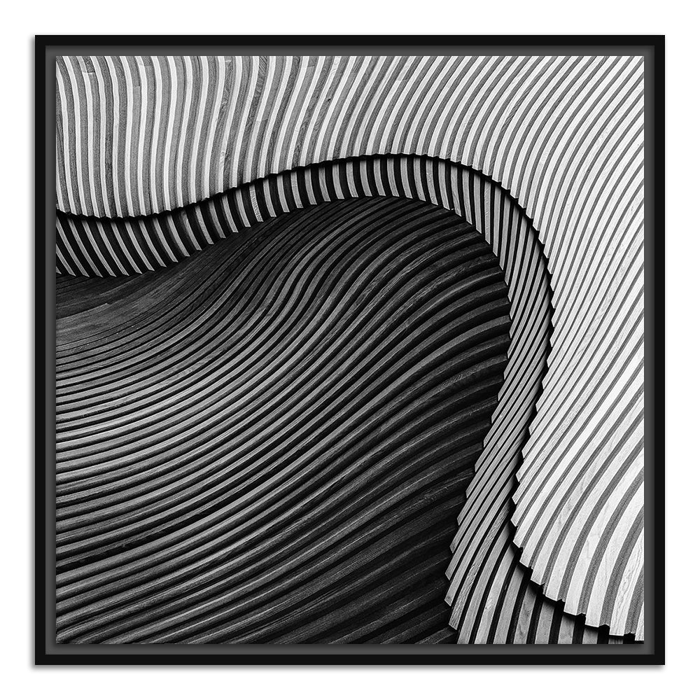 The canvas is wrapped and stretched similar to a gallery wrap and then mounted inside a wooden frame, leaving a small "gap", to create the illusion that the canvas is floating within the frame.