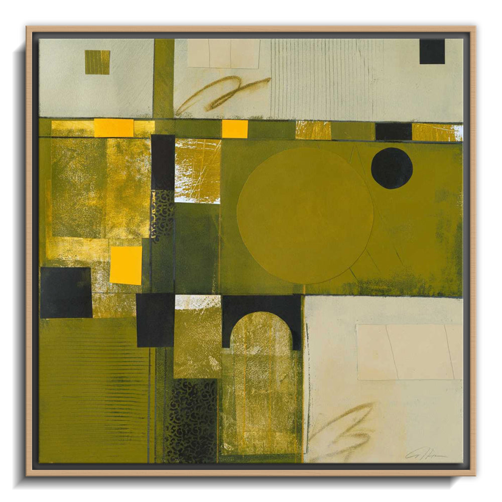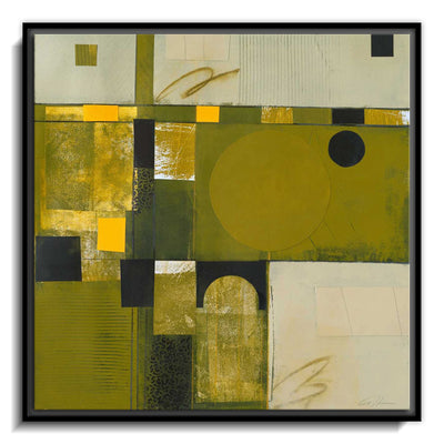 The canvas is wrapped and stretched similar to a gallery wrap and then mounted inside a wooden frame, leaving a small "gap", to create the illusion that the canvas is floating within the frame.