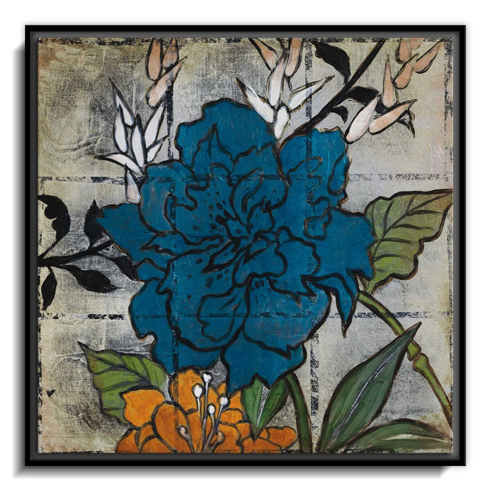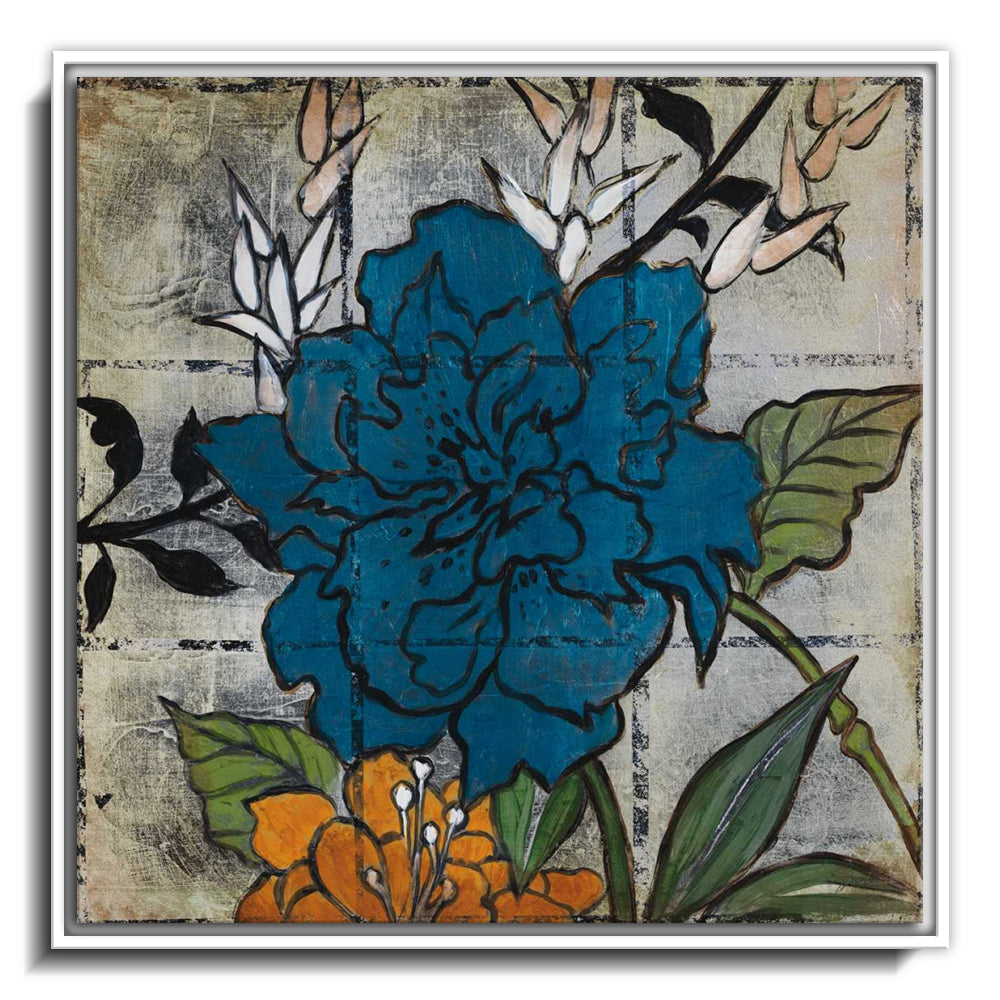 The canvas is wrapped and stretched similar to a gallery wrap and then mounted inside a wooden frame, leaving a small "gap", to create the illusion that the canvas is floating within the frame.