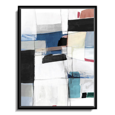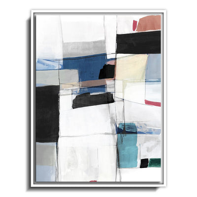 The canvas is wrapped and stretched similar to a gallery wrap and then mounted inside a wooden frame, leaving a small "gap", to create the illusion that the canvas is floating within the frame.