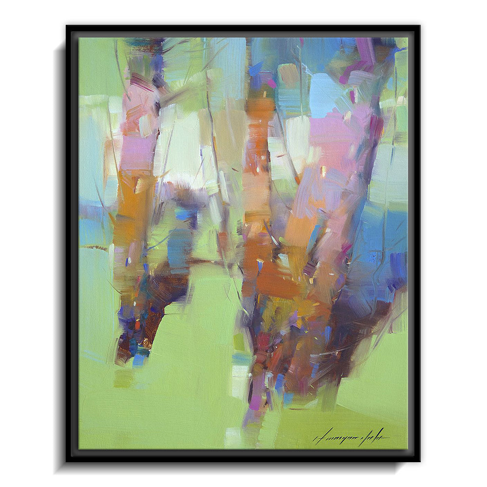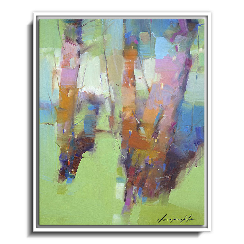 The canvas is wrapped and stretched similar to a gallery wrap and then mounted inside a wooden frame, leaving a small "gap", to create the illusion that the canvas is floating within the frame.