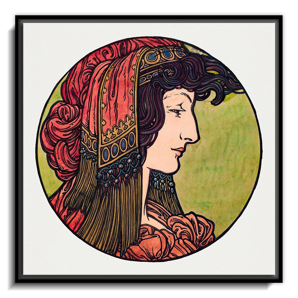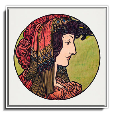 The canvas is wrapped and stretched similar to a gallery wrap and then mounted inside a wooden frame, leaving a small "gap", to create the illusion that the canvas is floating within the frame.