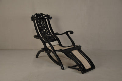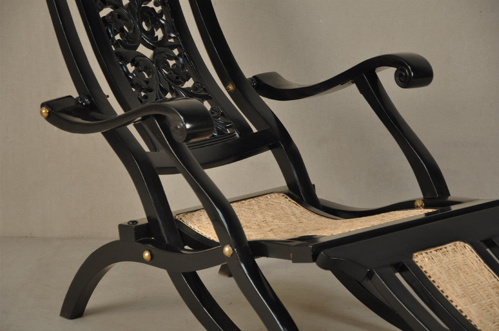 This folding deck chair in solid teak wood has a carved back panel and an elegant top rail. The beautifully hand caned seat & leg rest make it an extremely comfortable piece ideal for a verandah or lounge corner. It can be folded and stored when not in use. The unique design allows it to be used for varying positions with legs completely straight or folded comfortably at the knees.