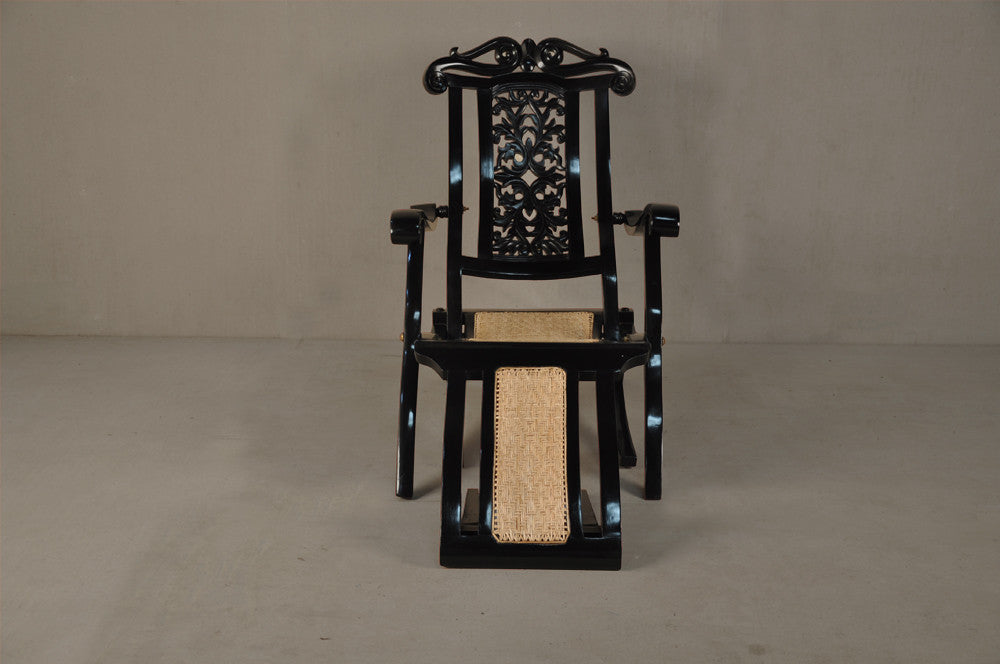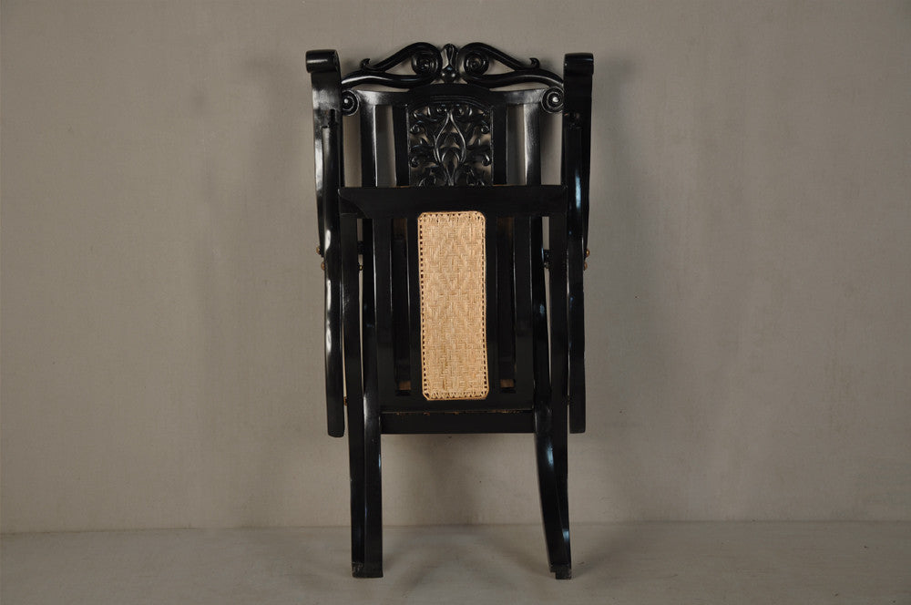 The chair is finished with traditional black polish and wax. Some of the original brass hardware was found missing and has been fabricated to match the original sample. It is hand caned with Assam cane in an intense diamond pattern.