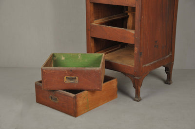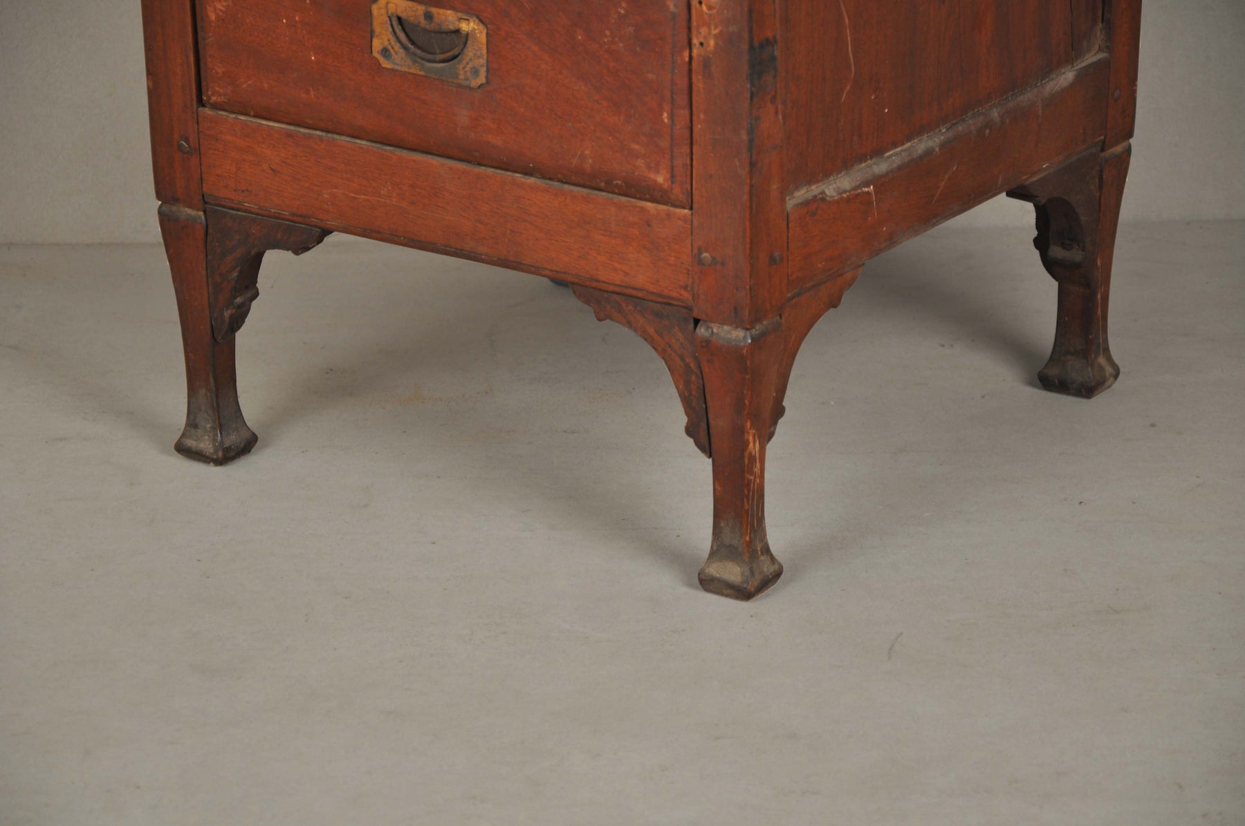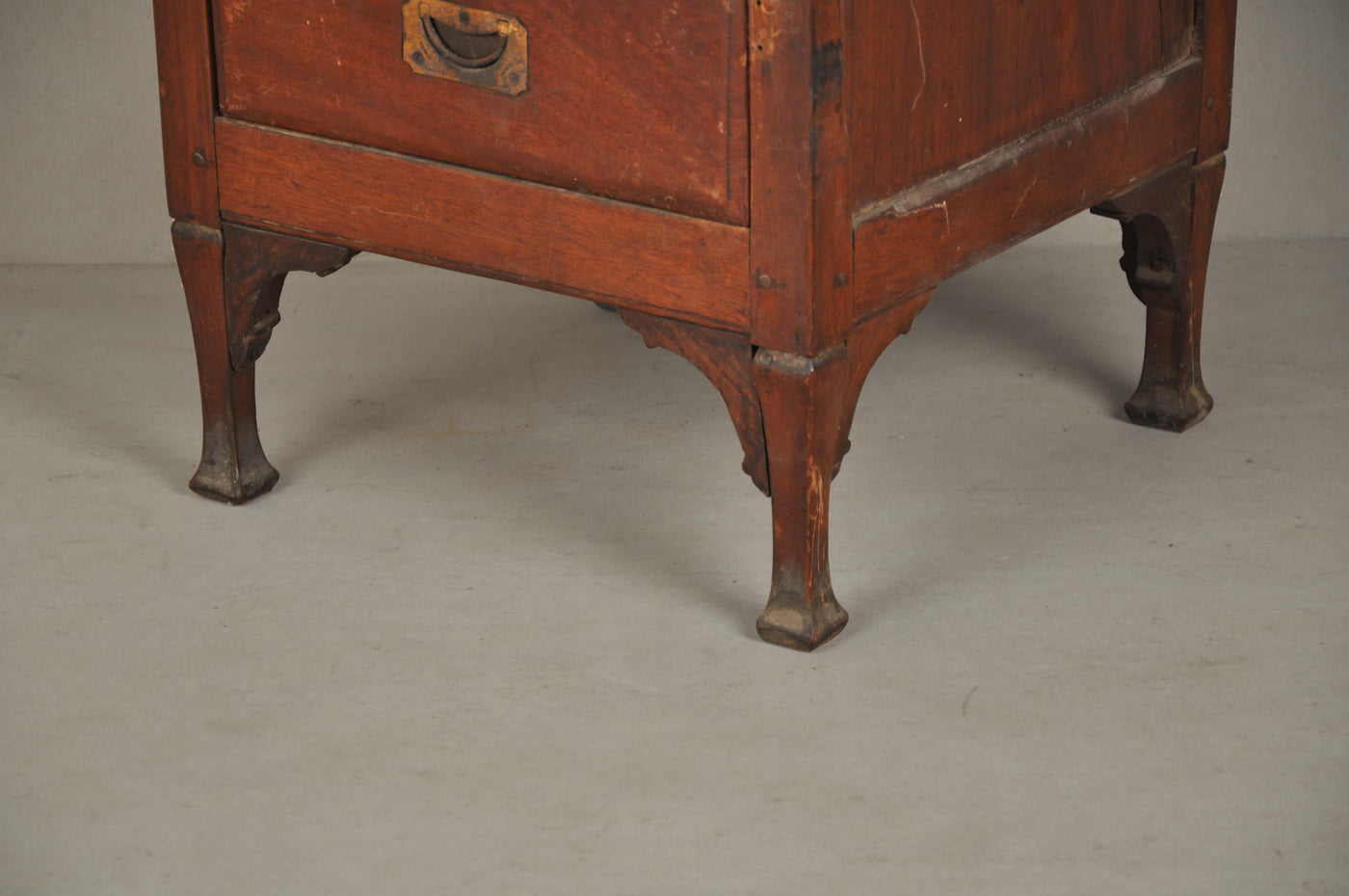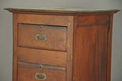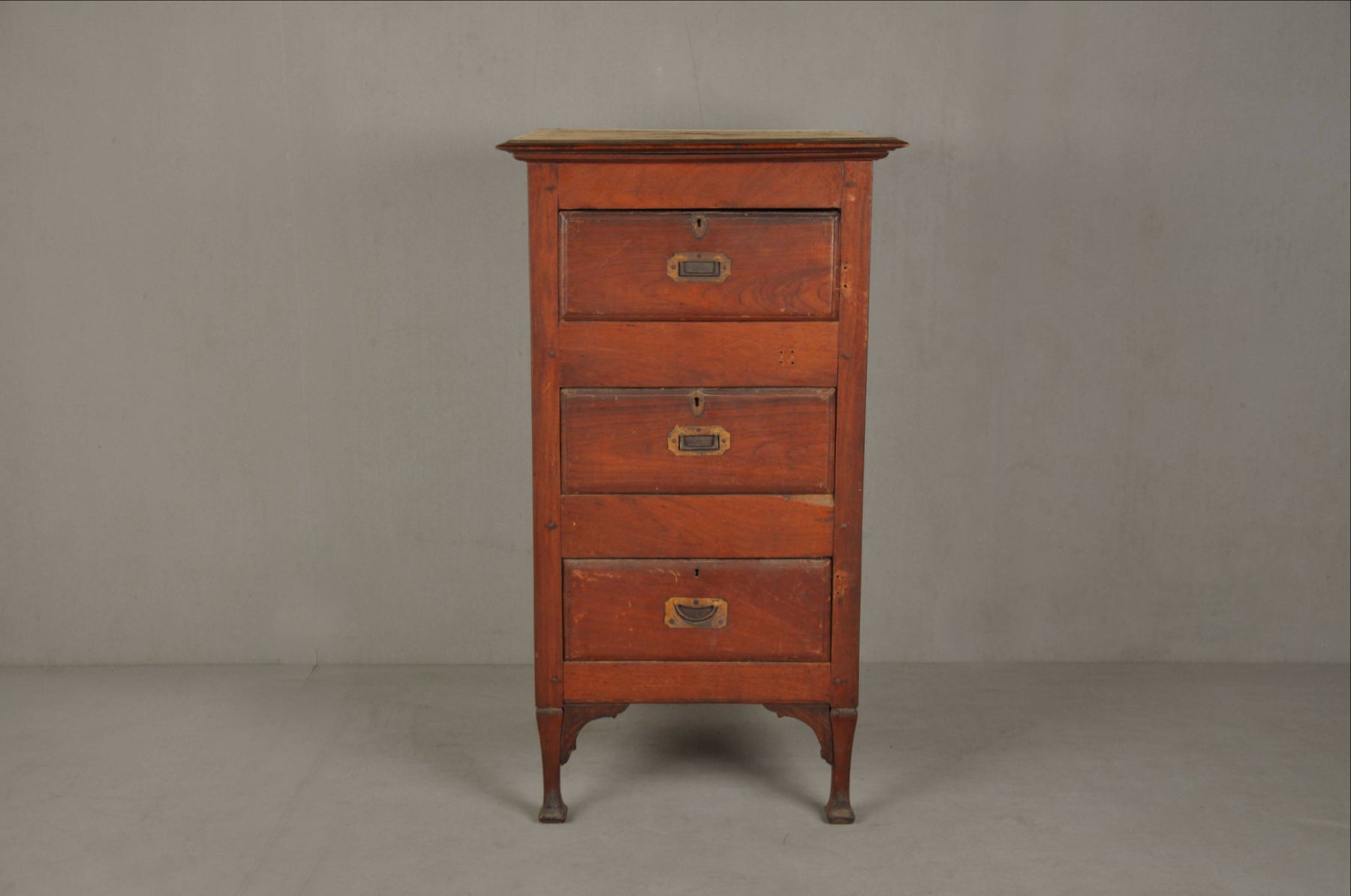 RESTORATION The piece is in good condition and will require a hand of natural polish and wax to bring out the beauty of the wood grain. There are some added drawer supports which will be replaced with salvaged teak wood. The brass hardware will be buffed to a shine and a set of new keys will be made to fit the old locks. The delivery time for 'As is' piece is 2-3 weeks and 'Restored' piece is 4-6 weeks.