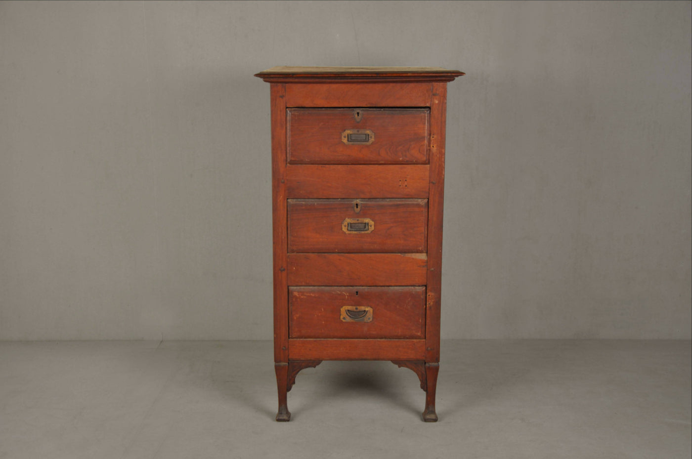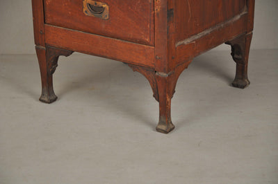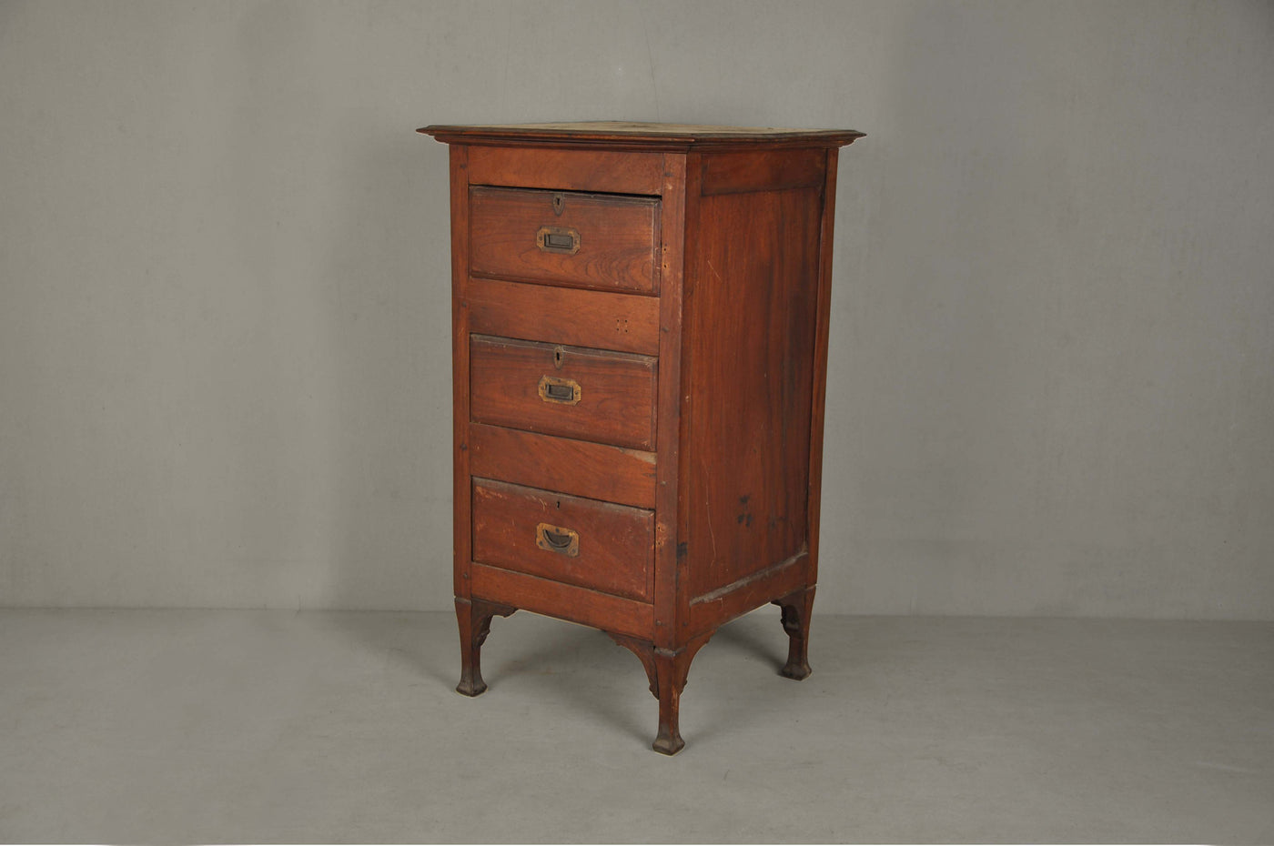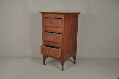 DESCRIPTION A well constructed night stand with three working drawers is a useful piece to have by the bedside. It can also be used in an office as a printing stand to hold paper, toners, etc. The stand has a well detailed top panel edge and very interesting low legs with wooden brackets. It is possible that the brackets were added over time and may not have been a part of the original design. There is slight chip in the fixed panel between the middle and bottom drawer. All three drawers have brass pull handles and the top two have key hole plates. The top two brass handles are similar with the third one slightly varying in design.
