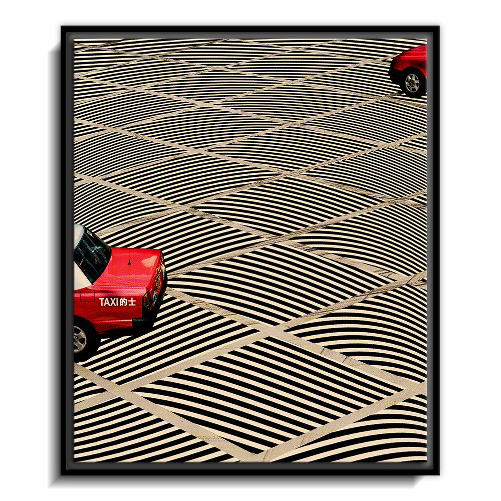 The canvas is wrapped and stretched similar to a gallery wrap and then mounted inside a wooden frame, leaving a small "gap", to create the illusion that the canvas is floating within the frame.