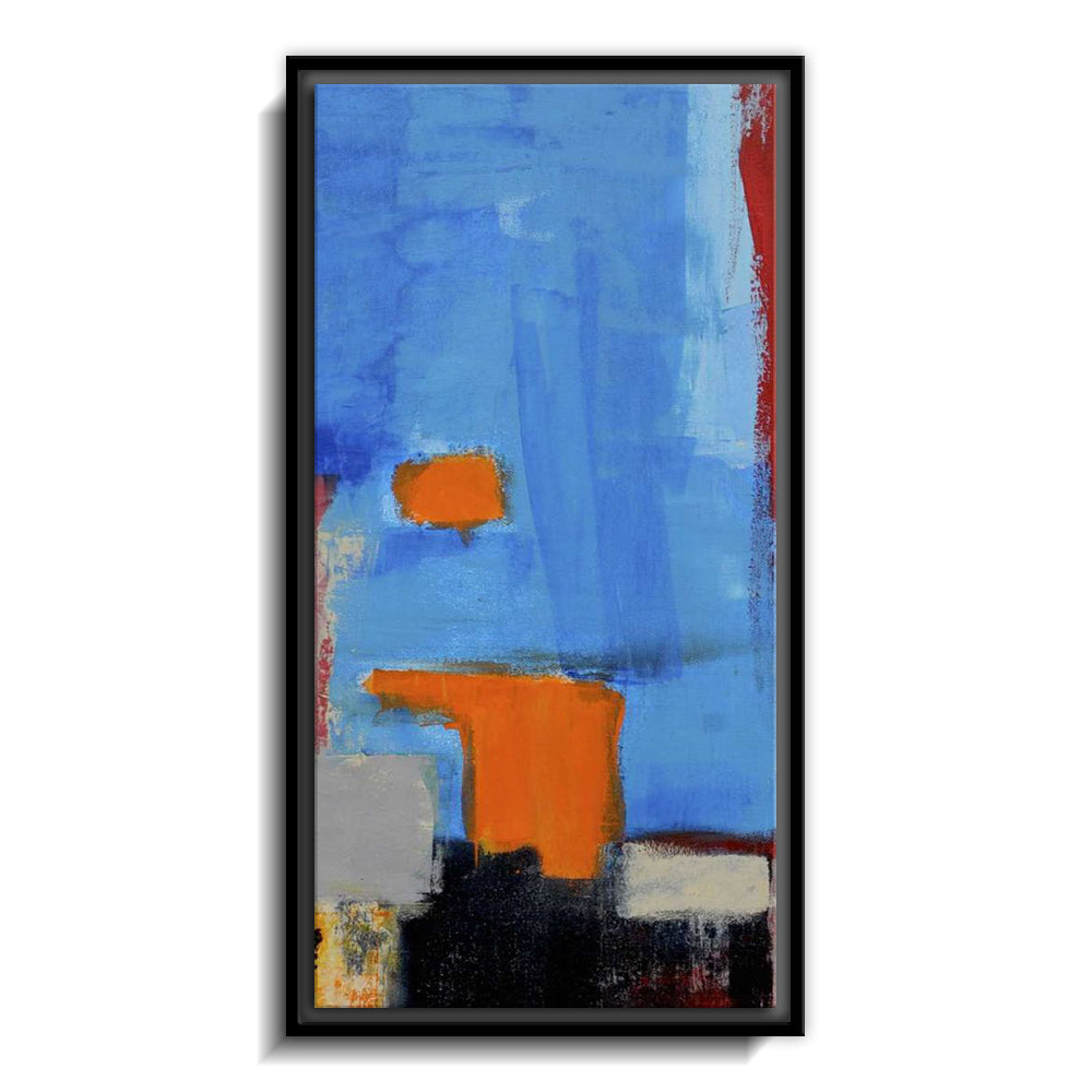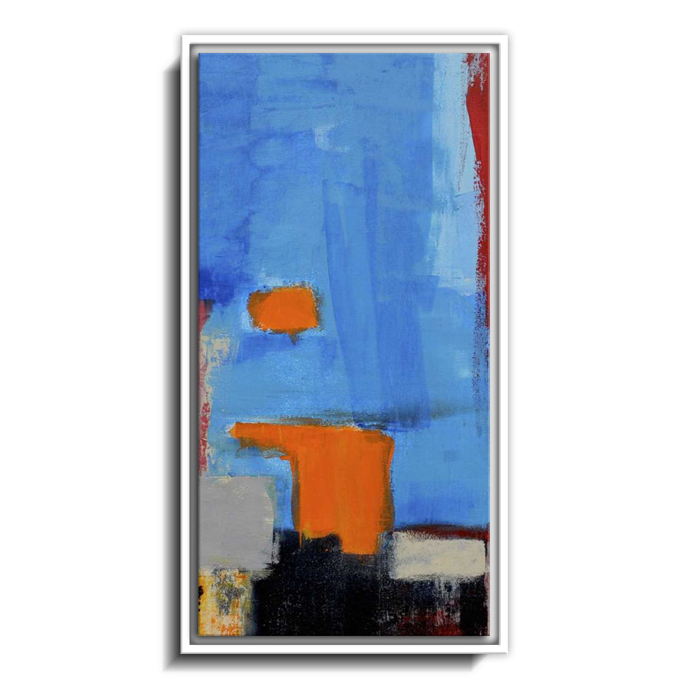 The canvas is wrapped and stretched similar to a gallery wrap and then mounted inside a wooden frame, leaving a small "gap", to create the illusion that the canvas is floating within the frame.
