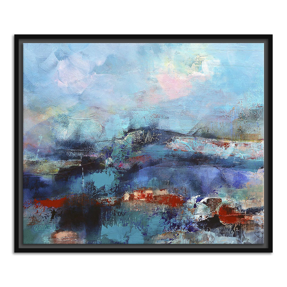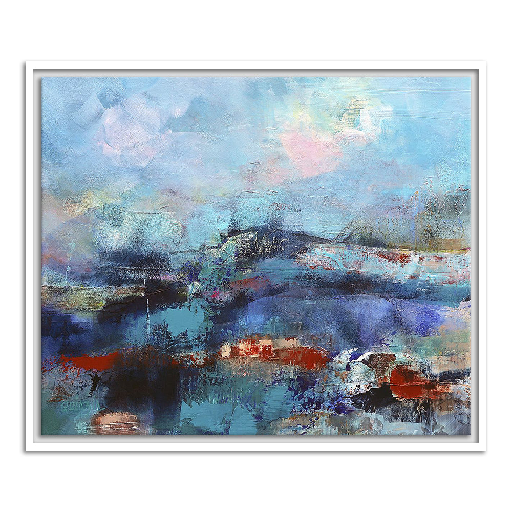 The canvas is wrapped and stretched similar to a gallery wrap and then mounted inside a wooden frame, leaving a small "gap", to create the illusion that the canvas is floating within the frame.
