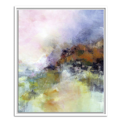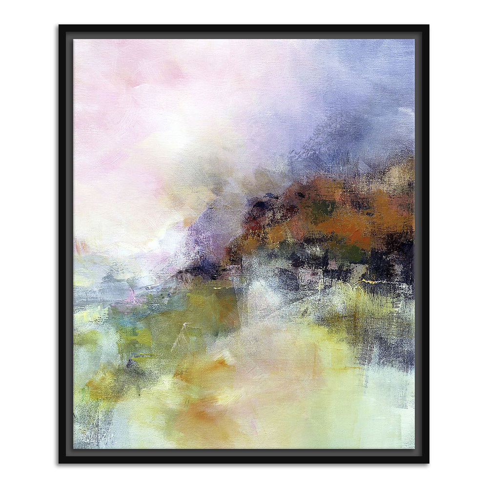 The canvas is wrapped and stretched similar to a gallery wrap and then mounted inside a wooden frame, leaving a small "gap", to create the illusion that the canvas is floating within the frame.